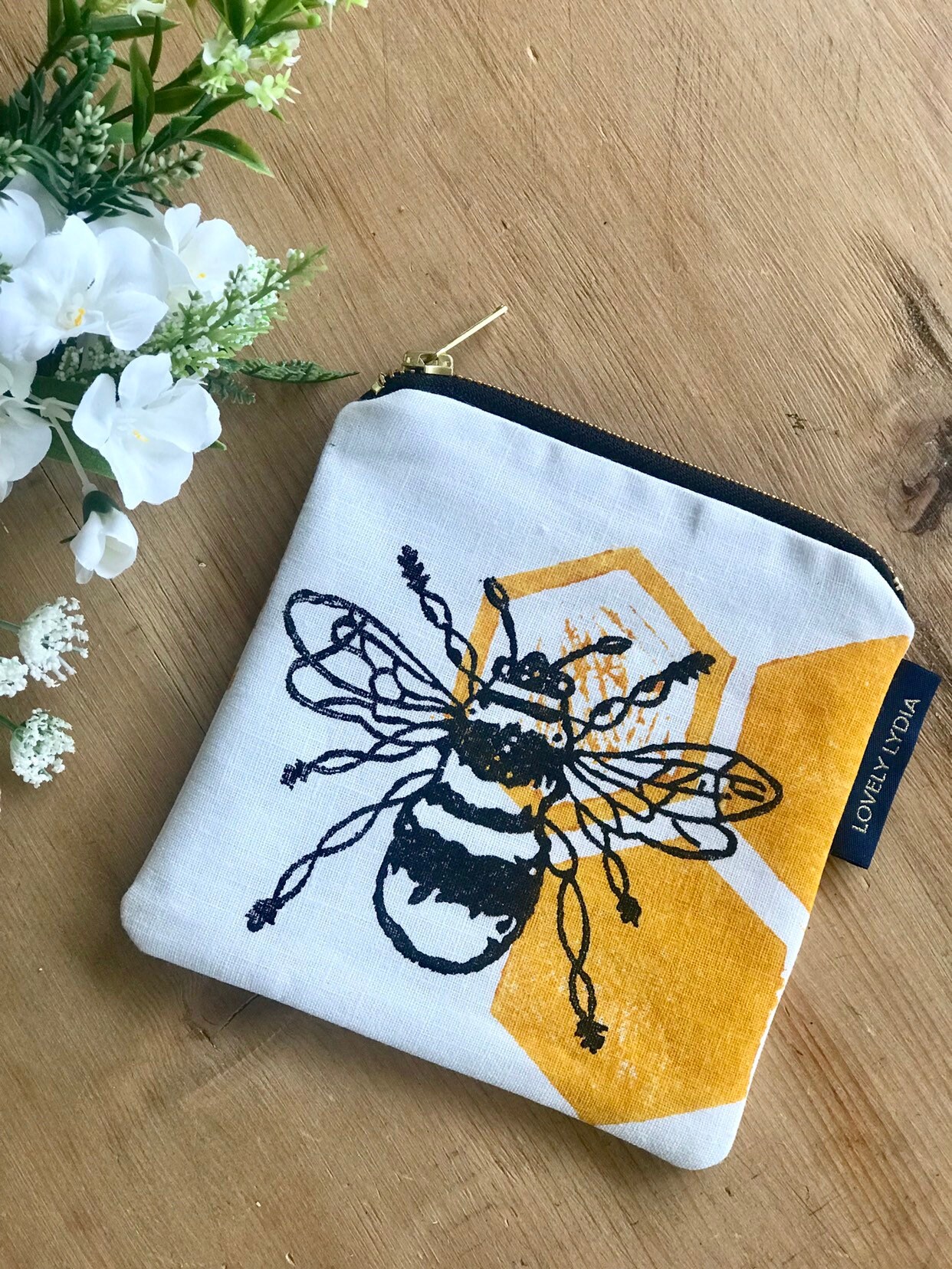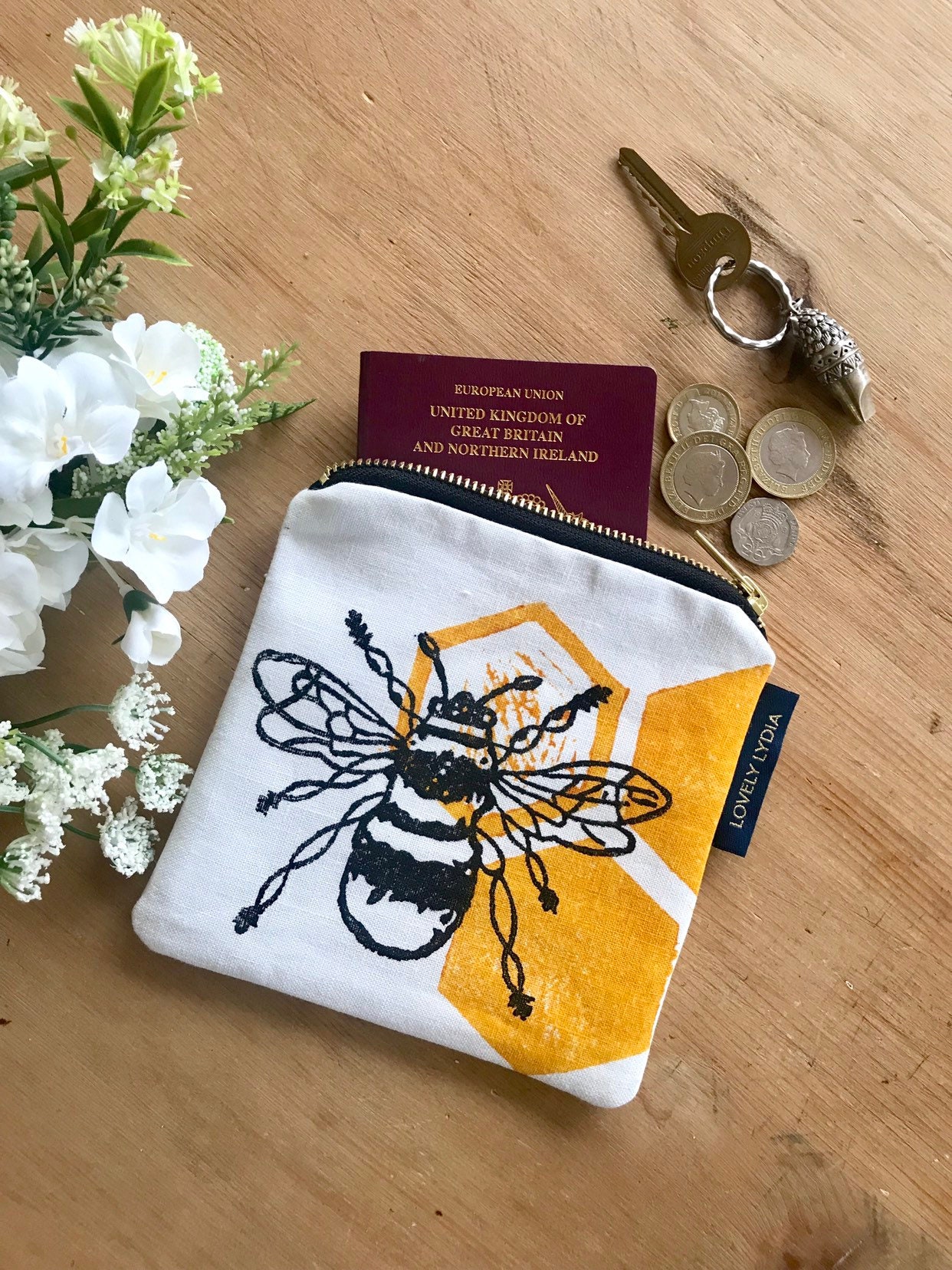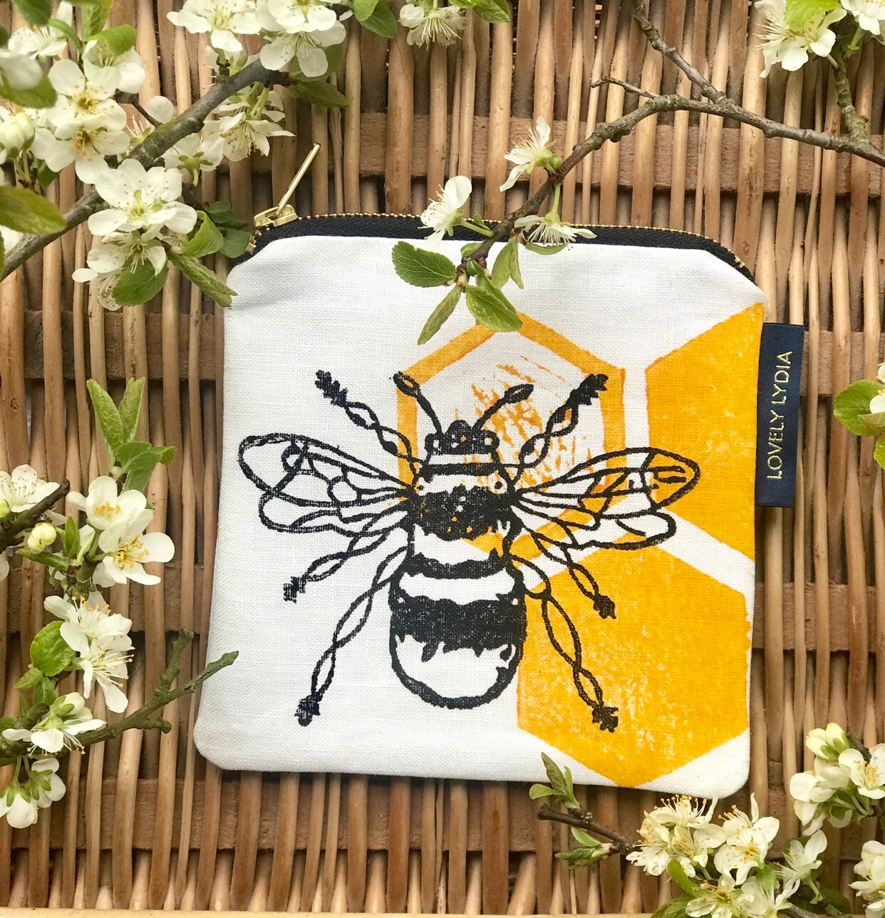Gorgeous Little Zipper Purse in Natural Linen printed with a my Bee Honeycomb Motif- the size is ideal to hold a passport, keys, phone (obviously some are bigger than others!!) to stop them getting lost in your bag. ideal for a stocking filler or as a little birthday gift.