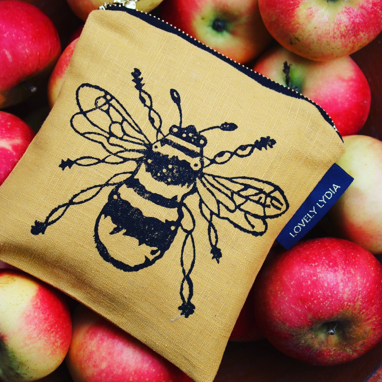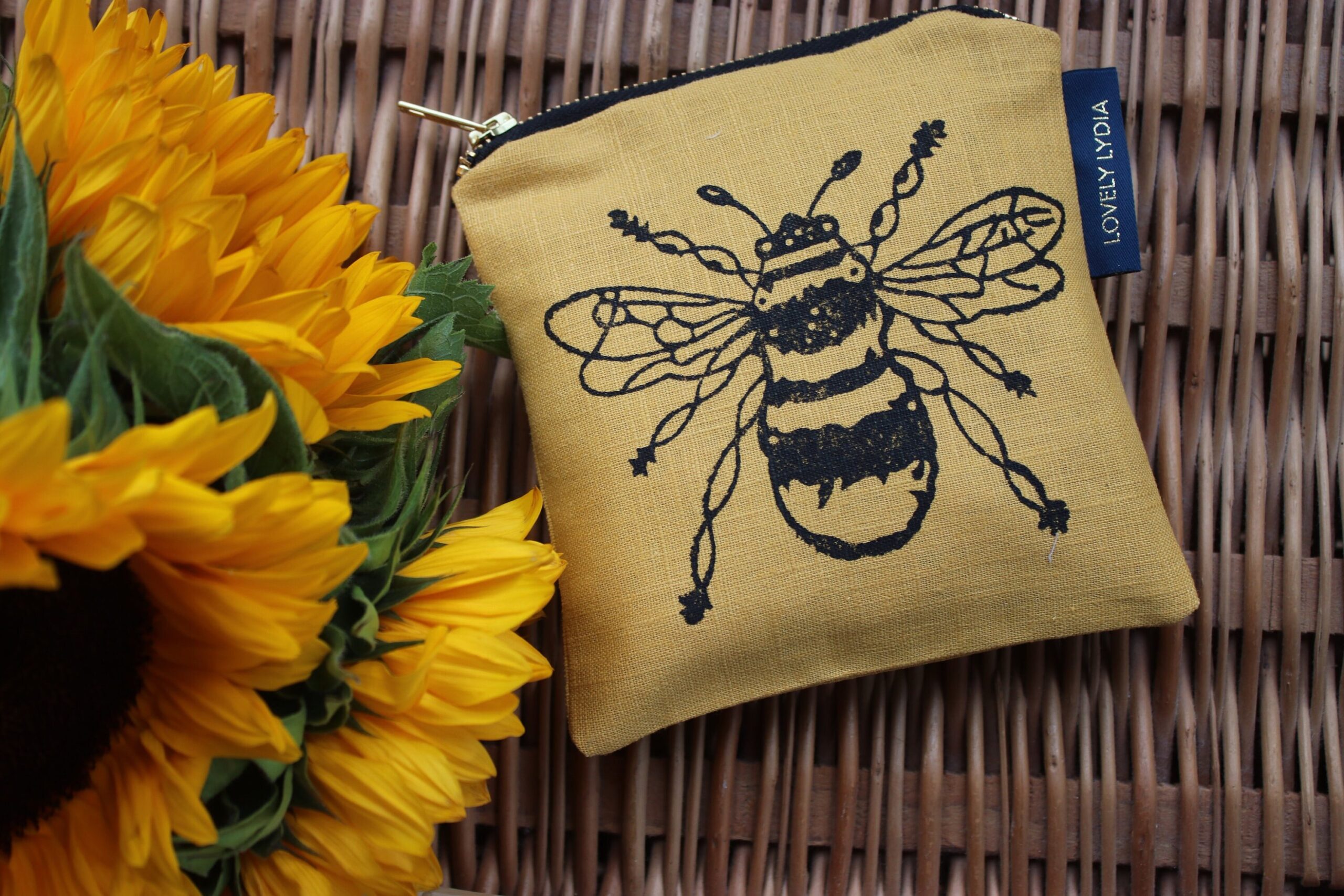 Gorgeous Little Zipper Purse in Mustard Linen printed with a Black Bee Motif- the size is ideal to hold a passport, keys, phone (obviously some are bigger than others!!) to stop them getting lost in your bag. ideal for a stocking filler or as a little birthday gift.