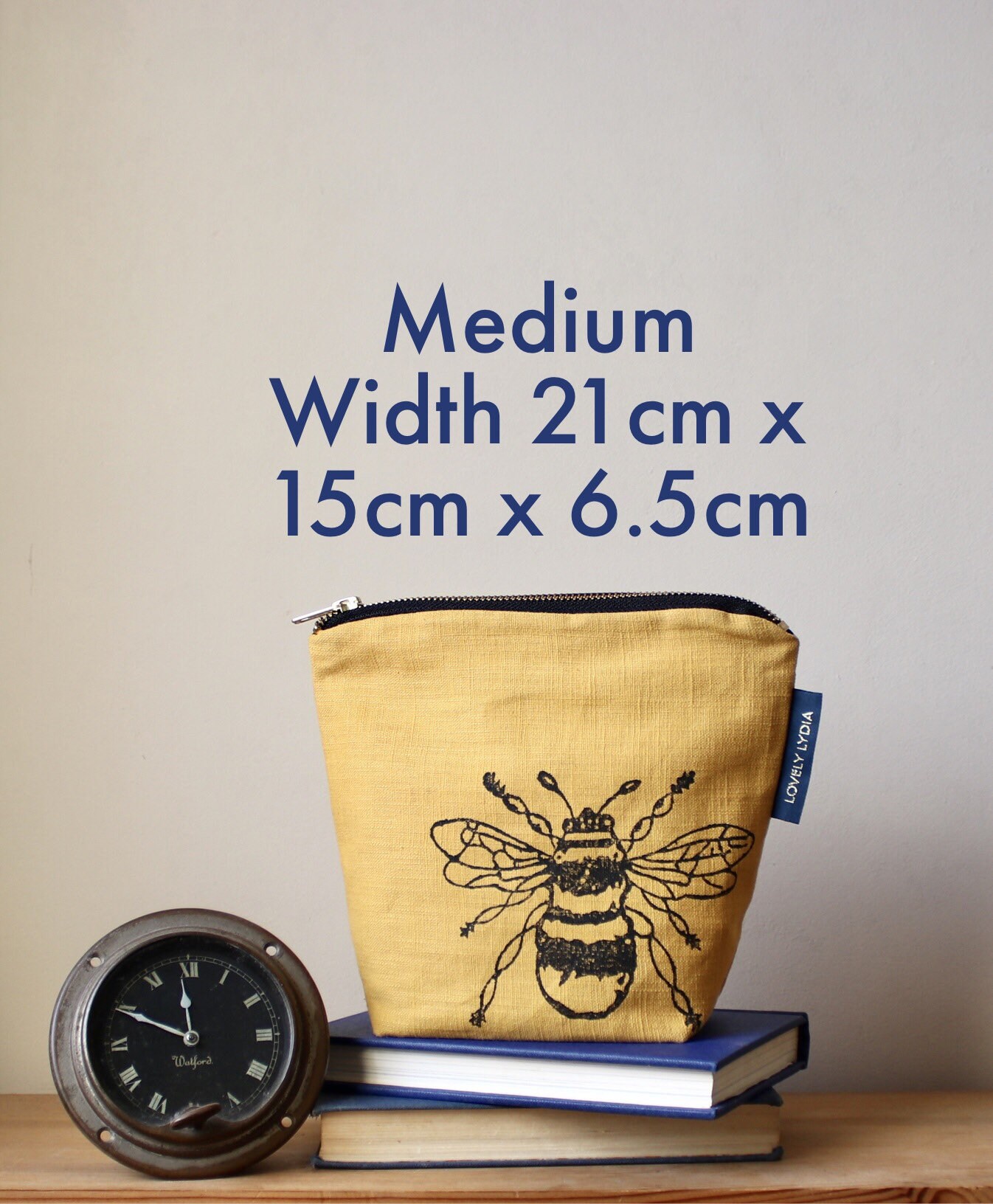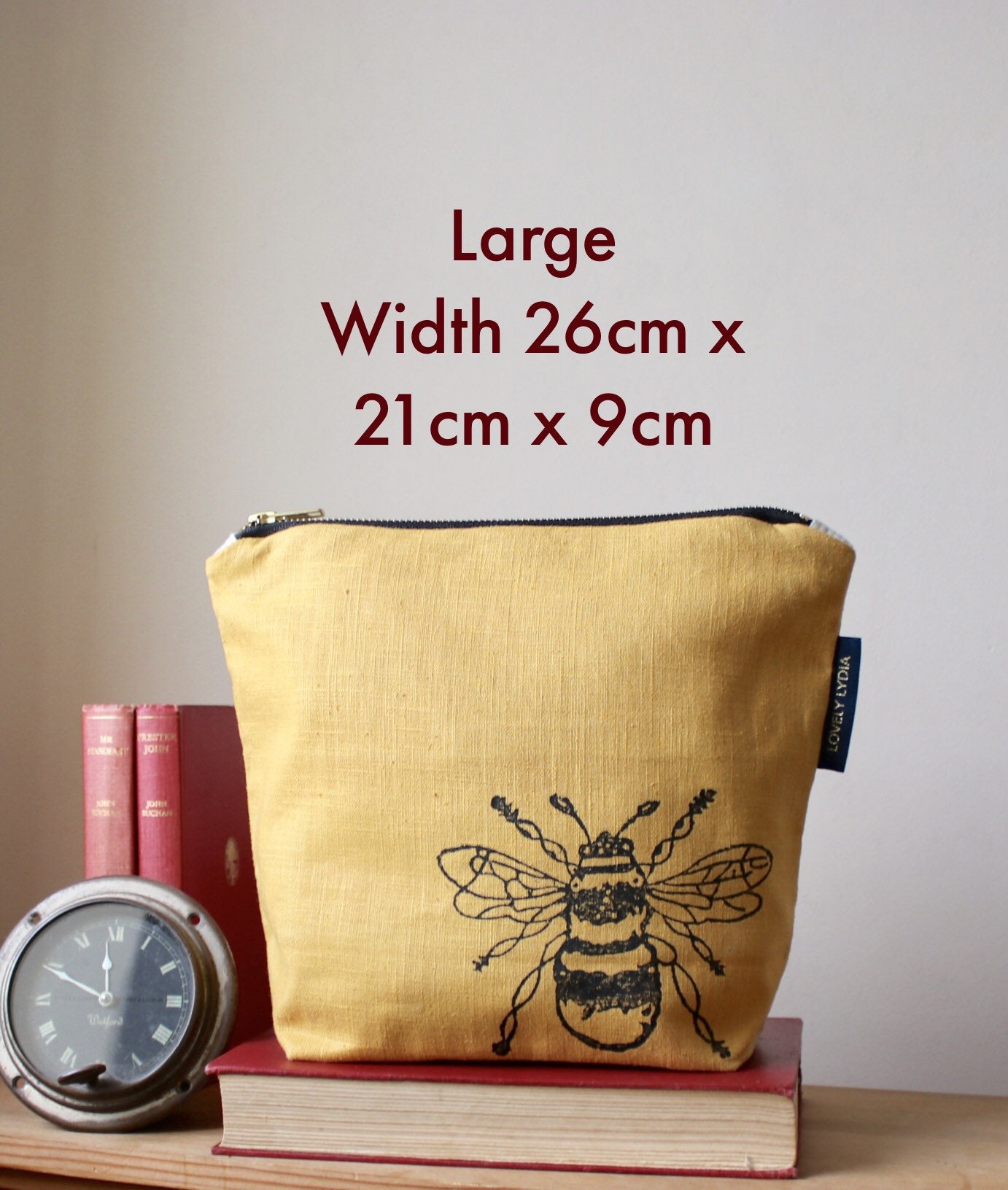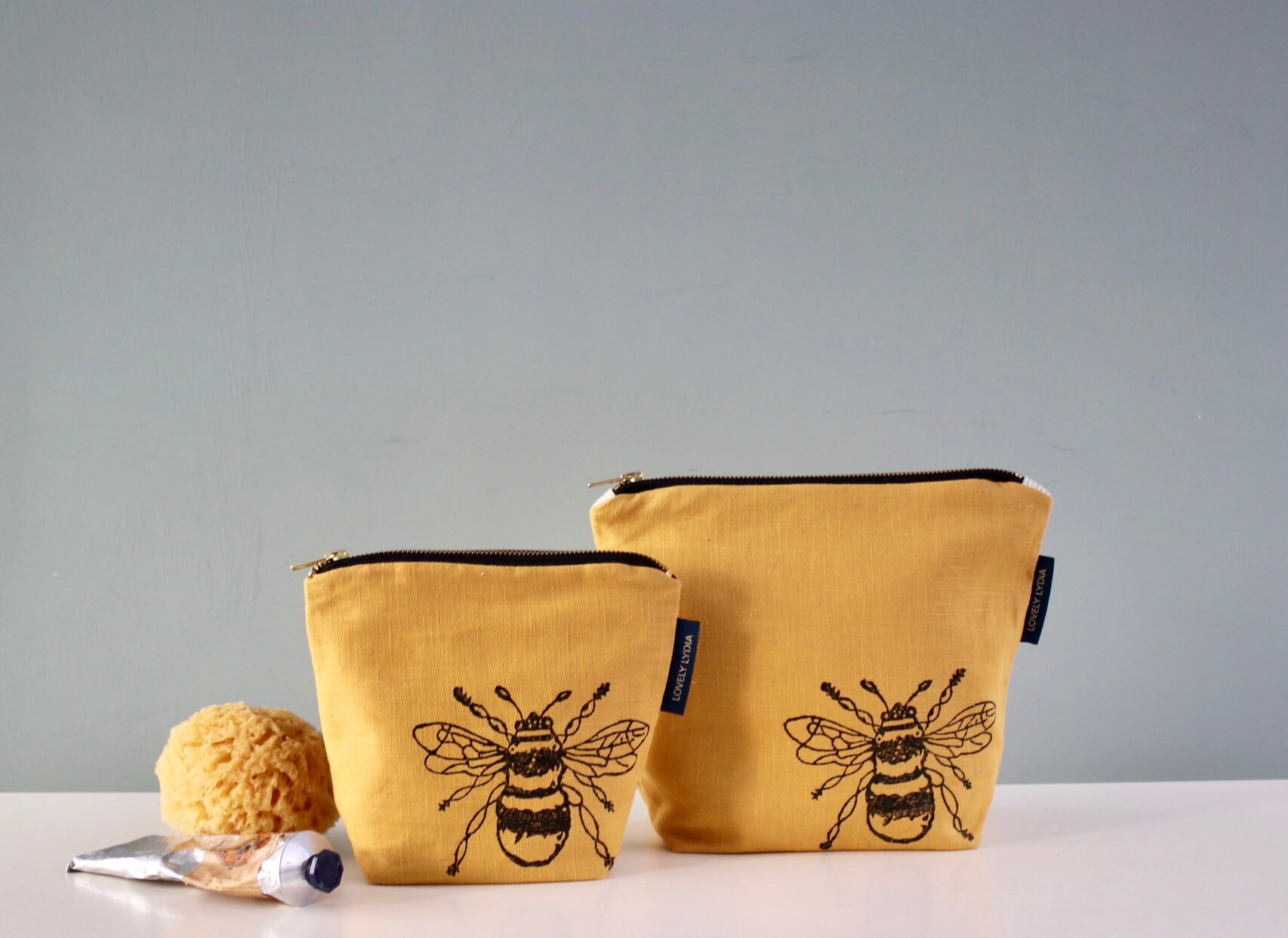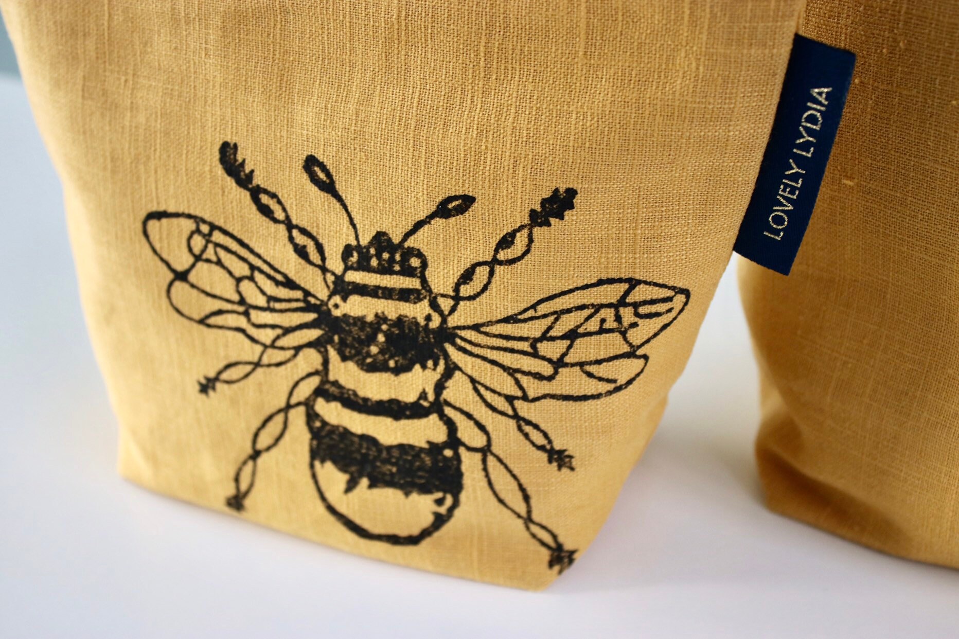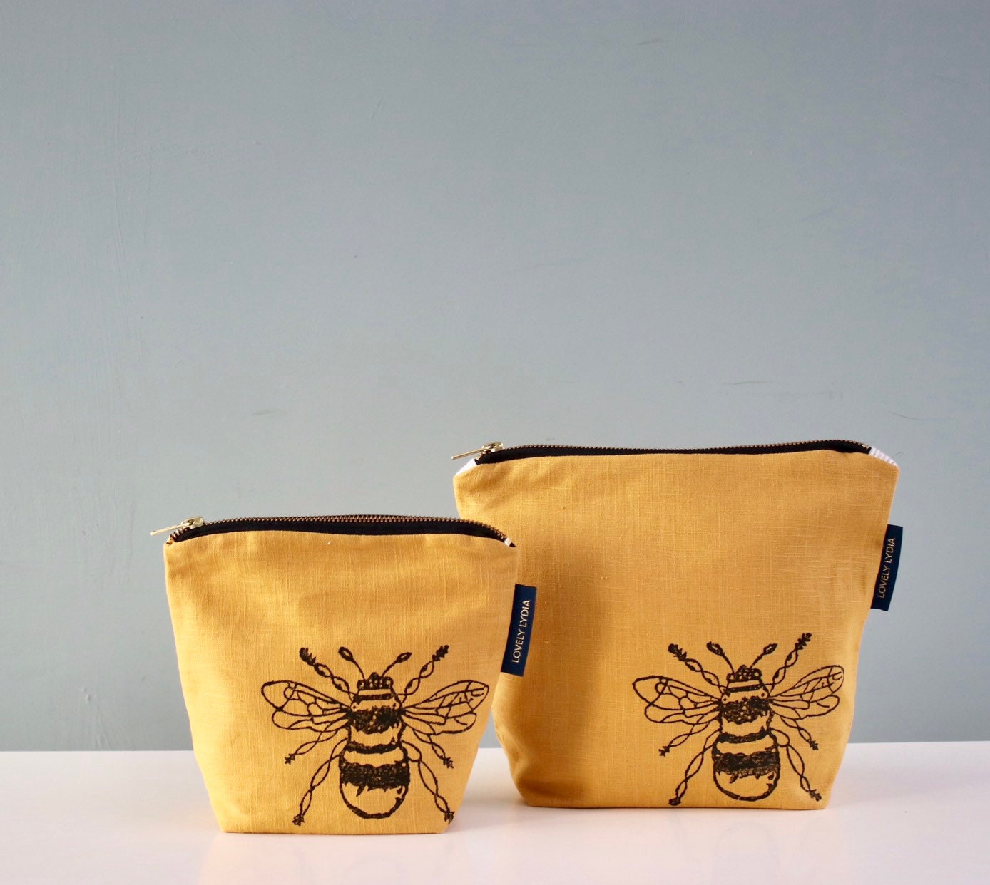 A lovely mustard yellow linen Washbag Zipper Bag hand printed with a Bumble Bee Motif, inspired by the Suffolk countryside round my home. I block print each one by hand so each one is unique!