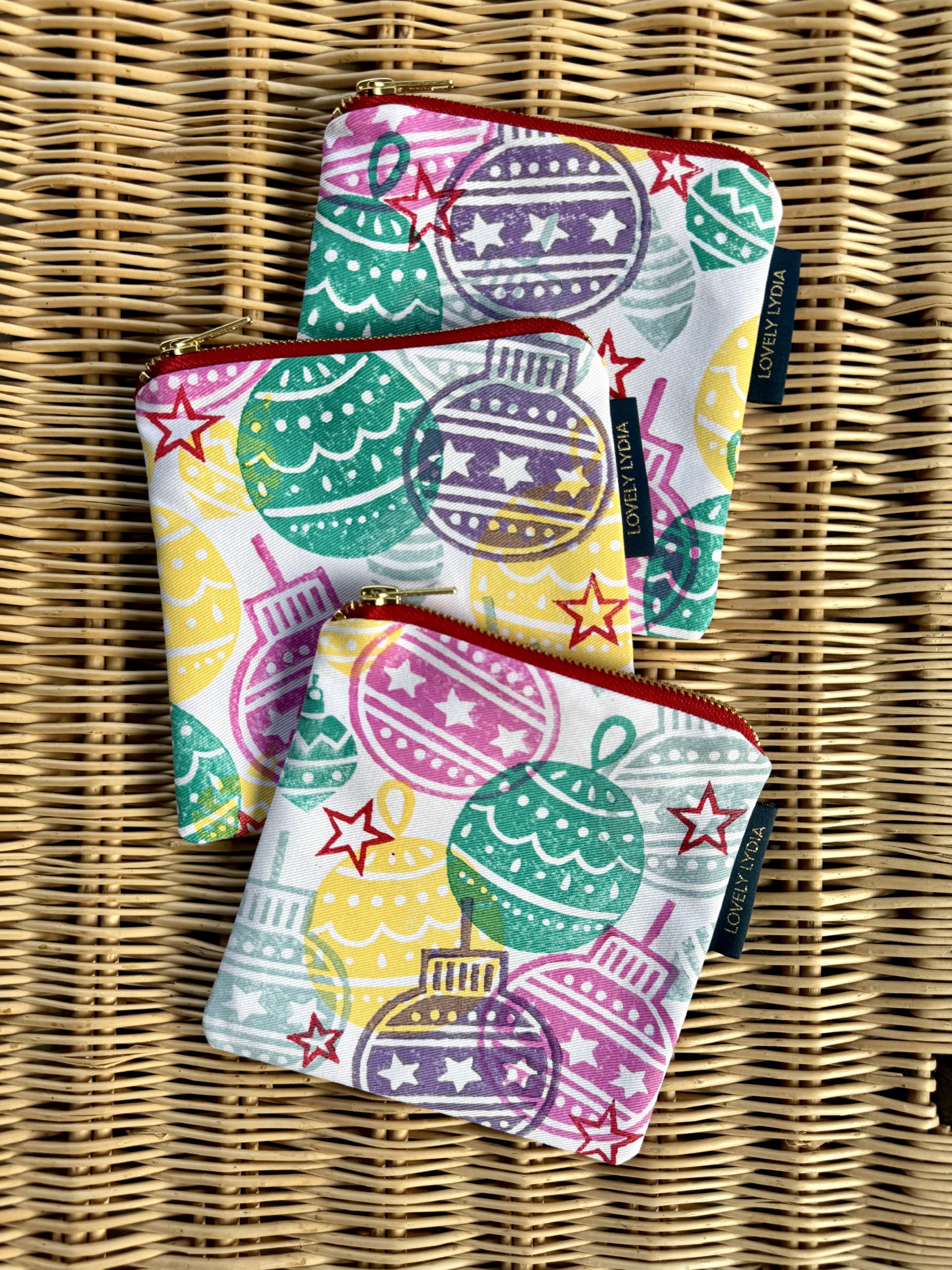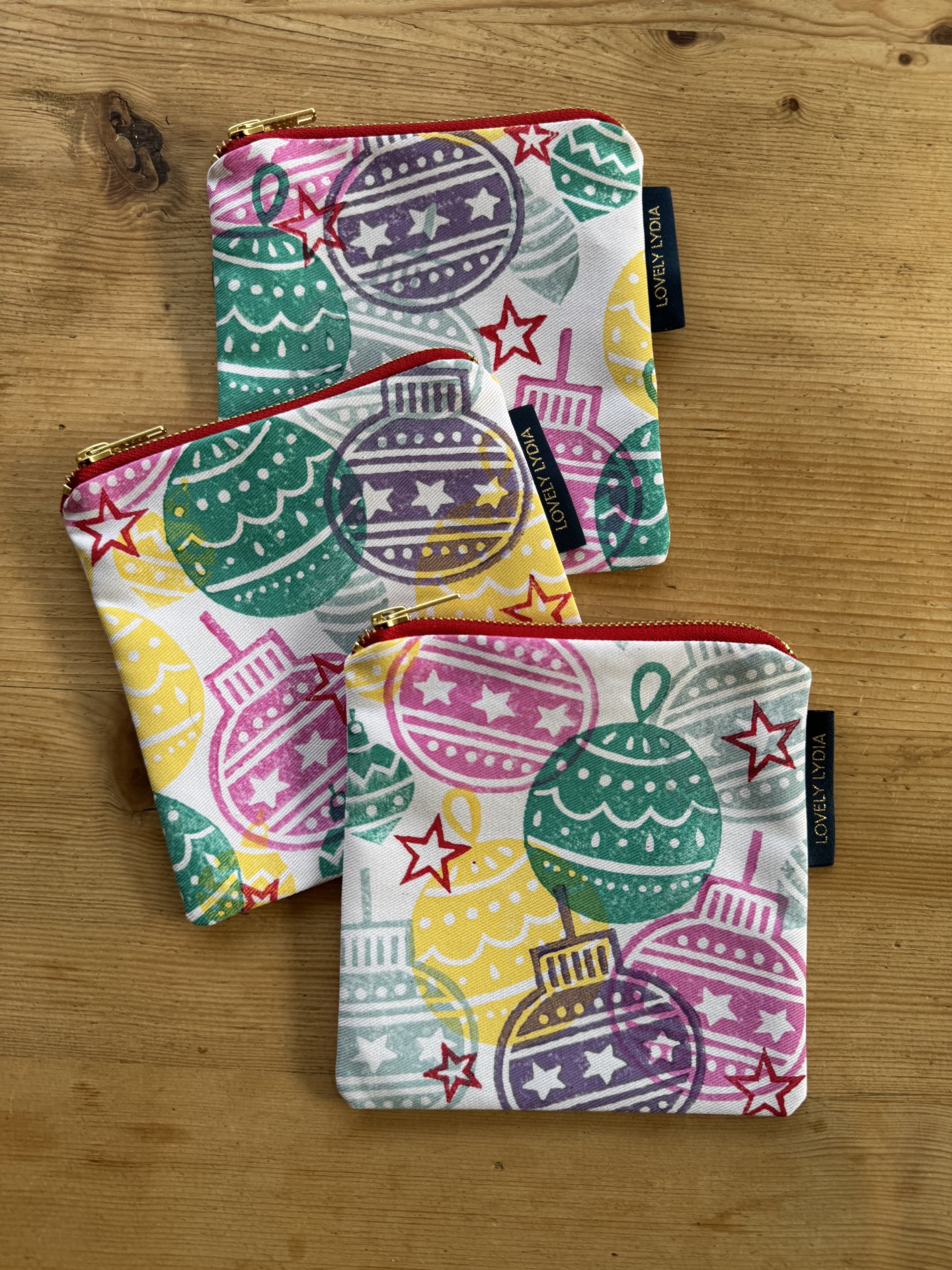 Gorgeous Small zipper purse hand printed with festive baubles- these zippers look small but they hold so much! An ideal size to hold a passport, keys, smart phone to stop them getting lost in your bag! ideal for a stocking filler pressie or as a little festive gift.