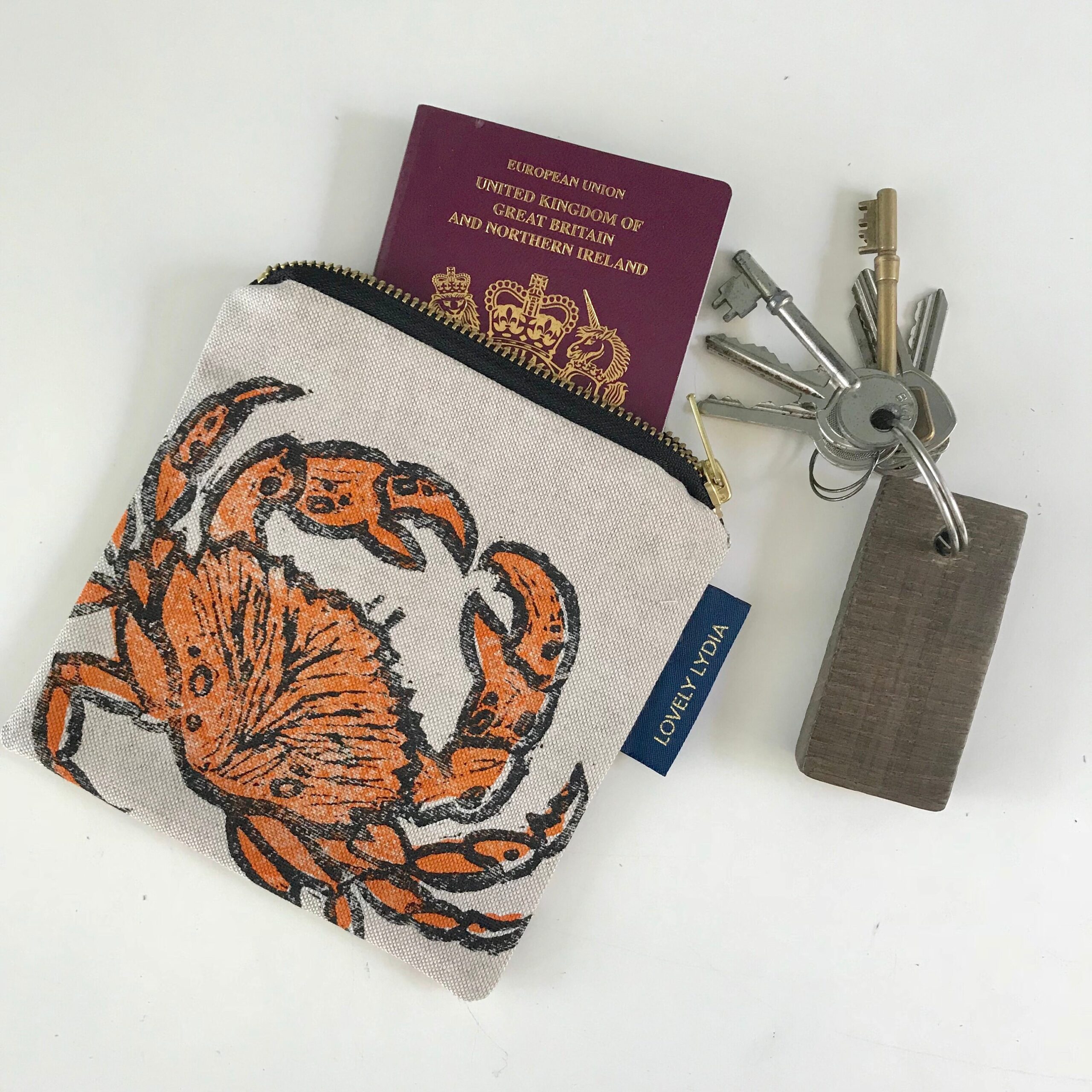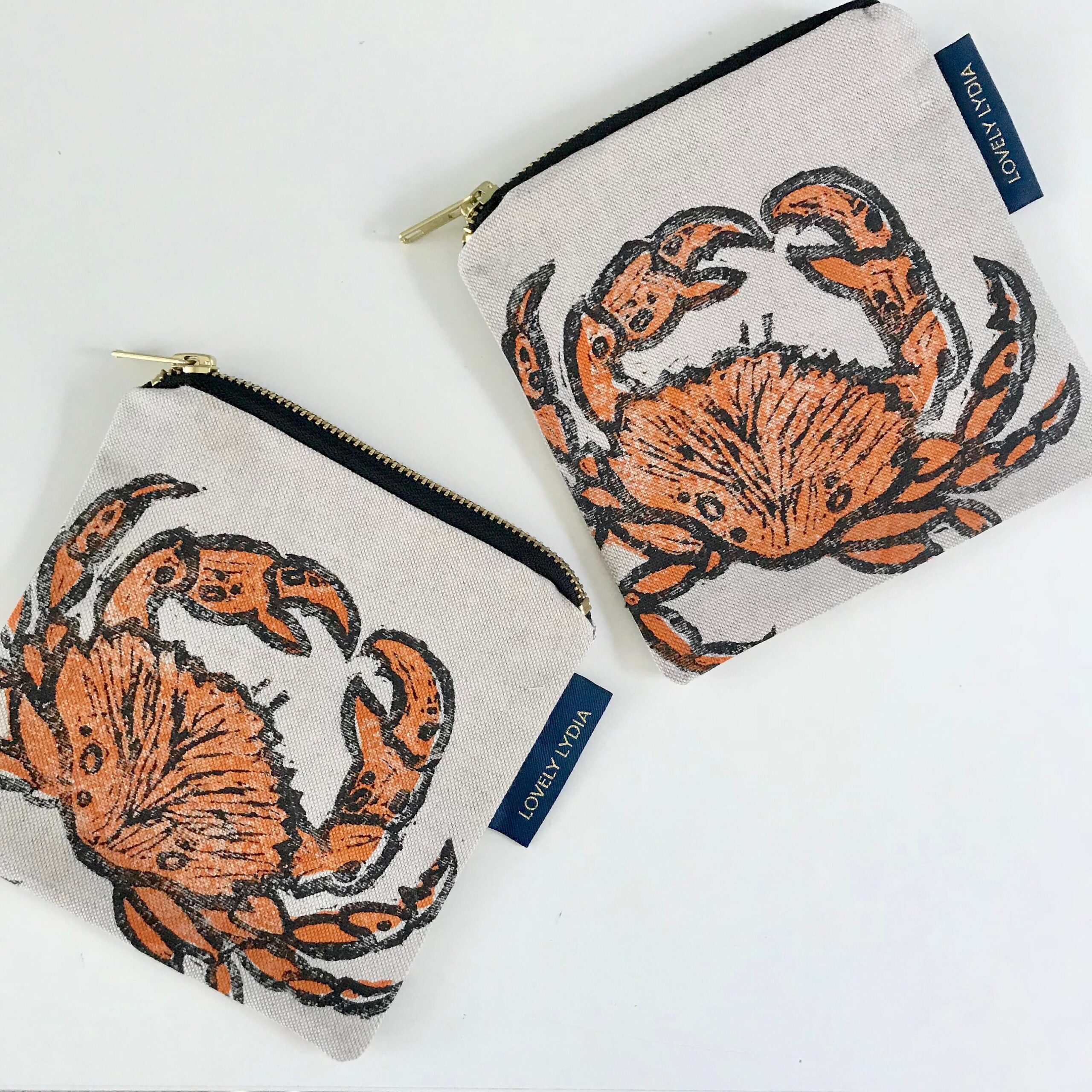 Gorgeous Small zipper purse hand printed with my Crab linoprint …ideal to hold a passport, keys, smart phone to stop them getting lost in your bag! ideal for a stocking filler pressie or as a birthday gift.