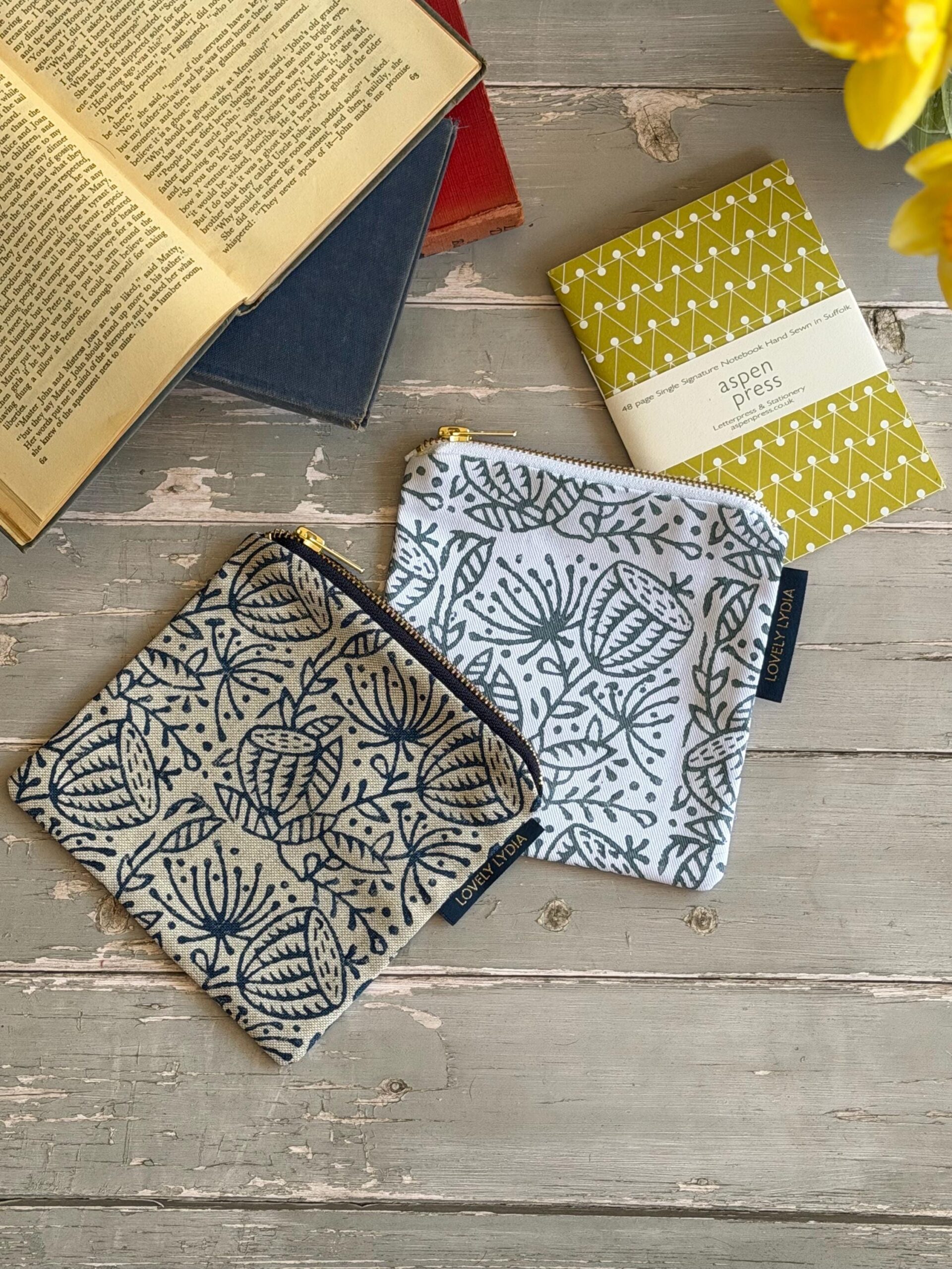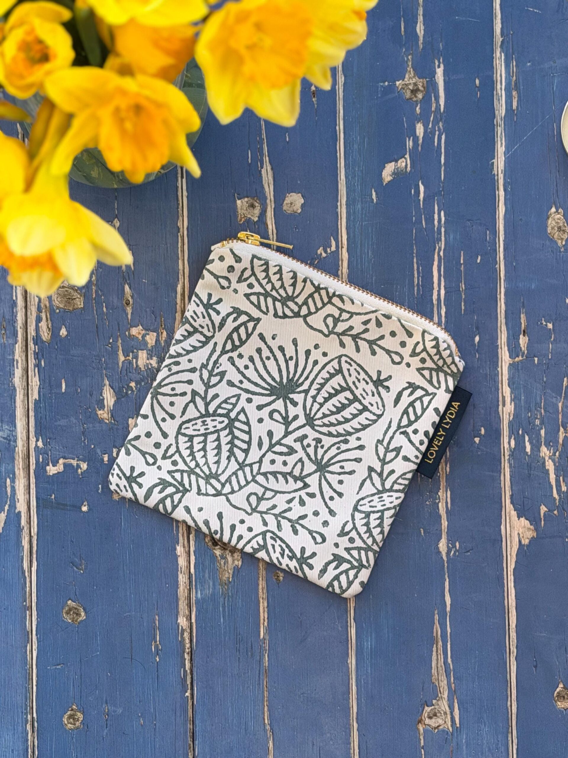 A lovely Handprinted Washbag Zipper in my Angelica Print, available in 3 autumnal colours. I block print each one by hand so they are all unique!