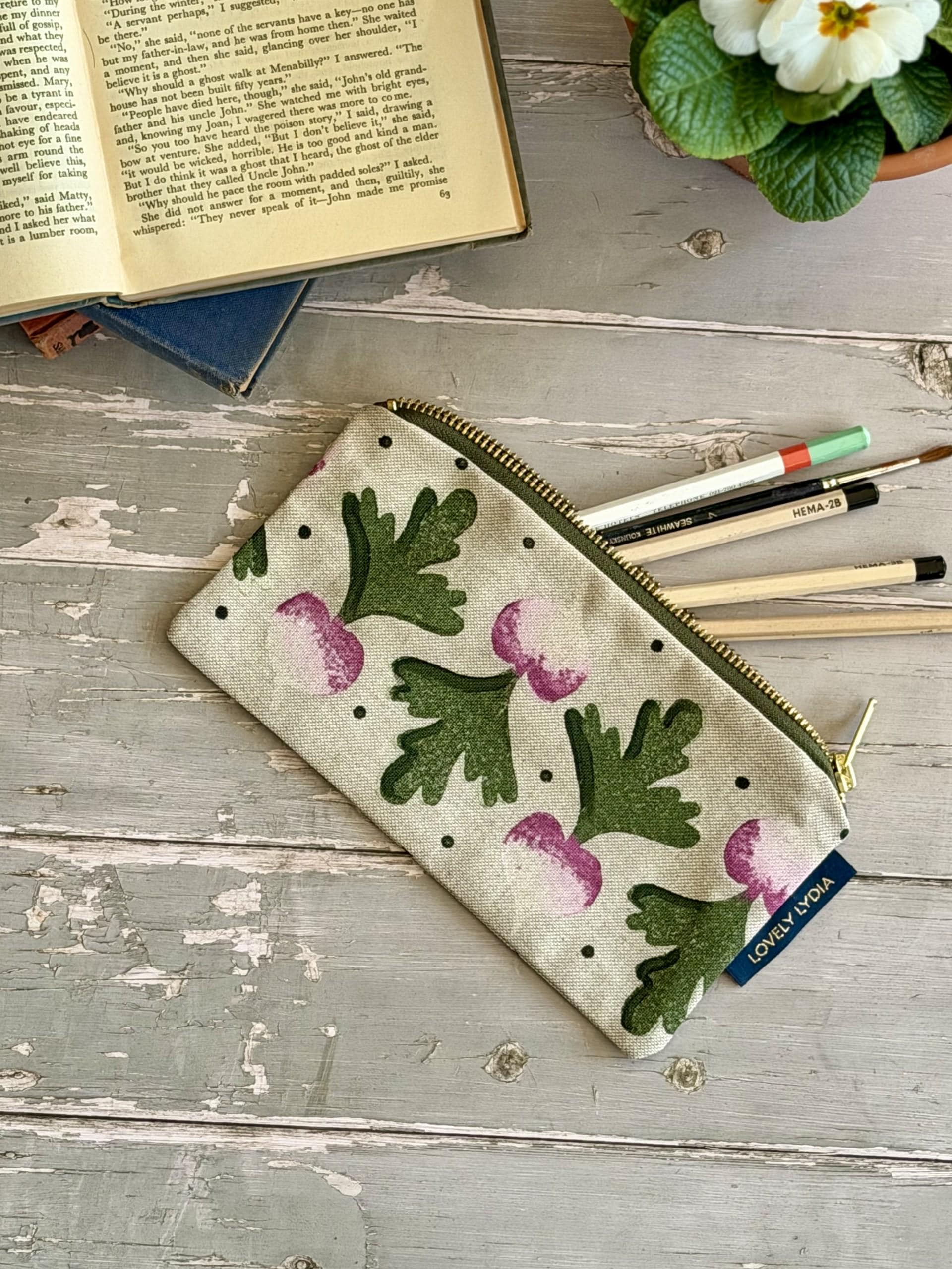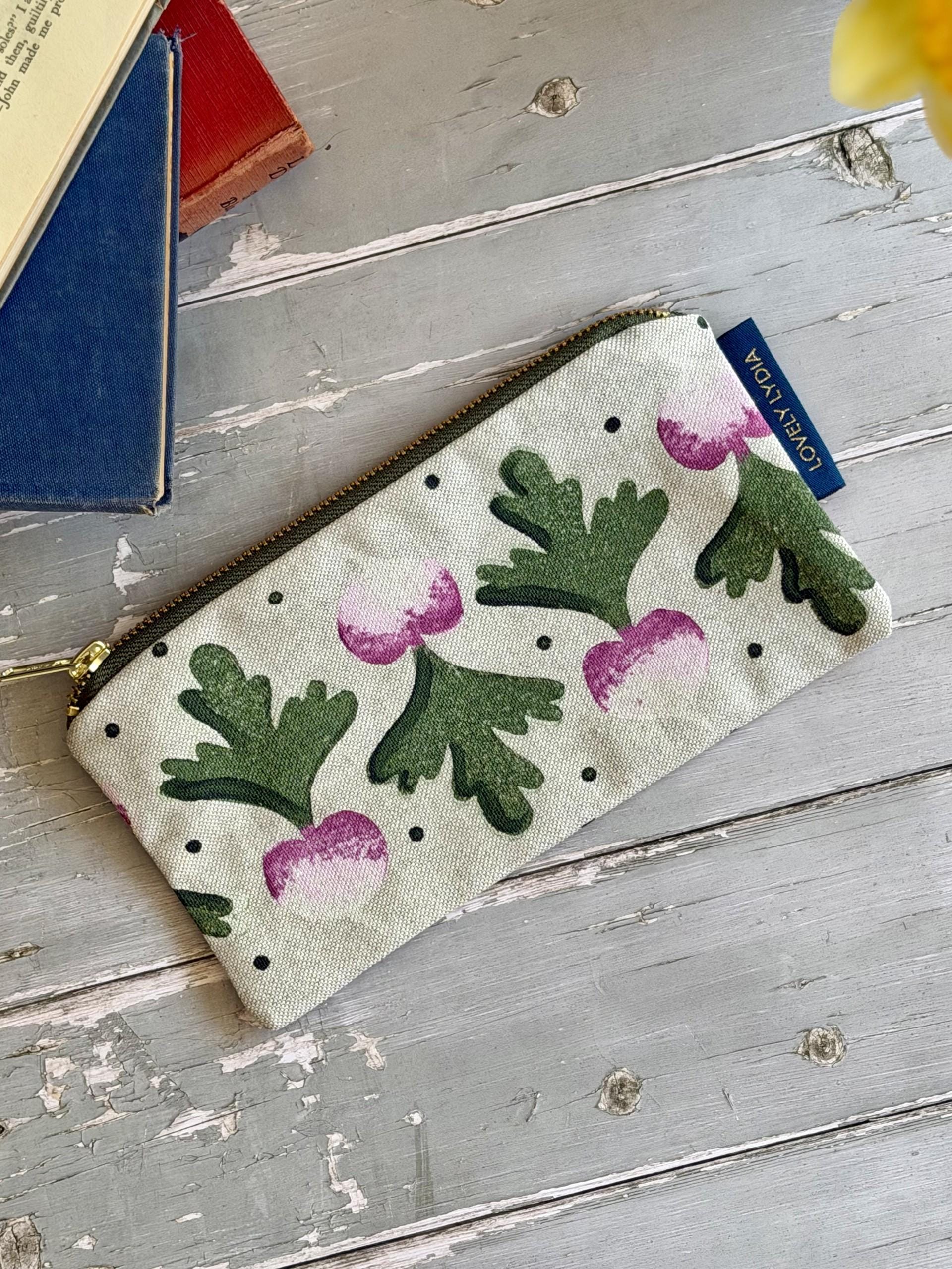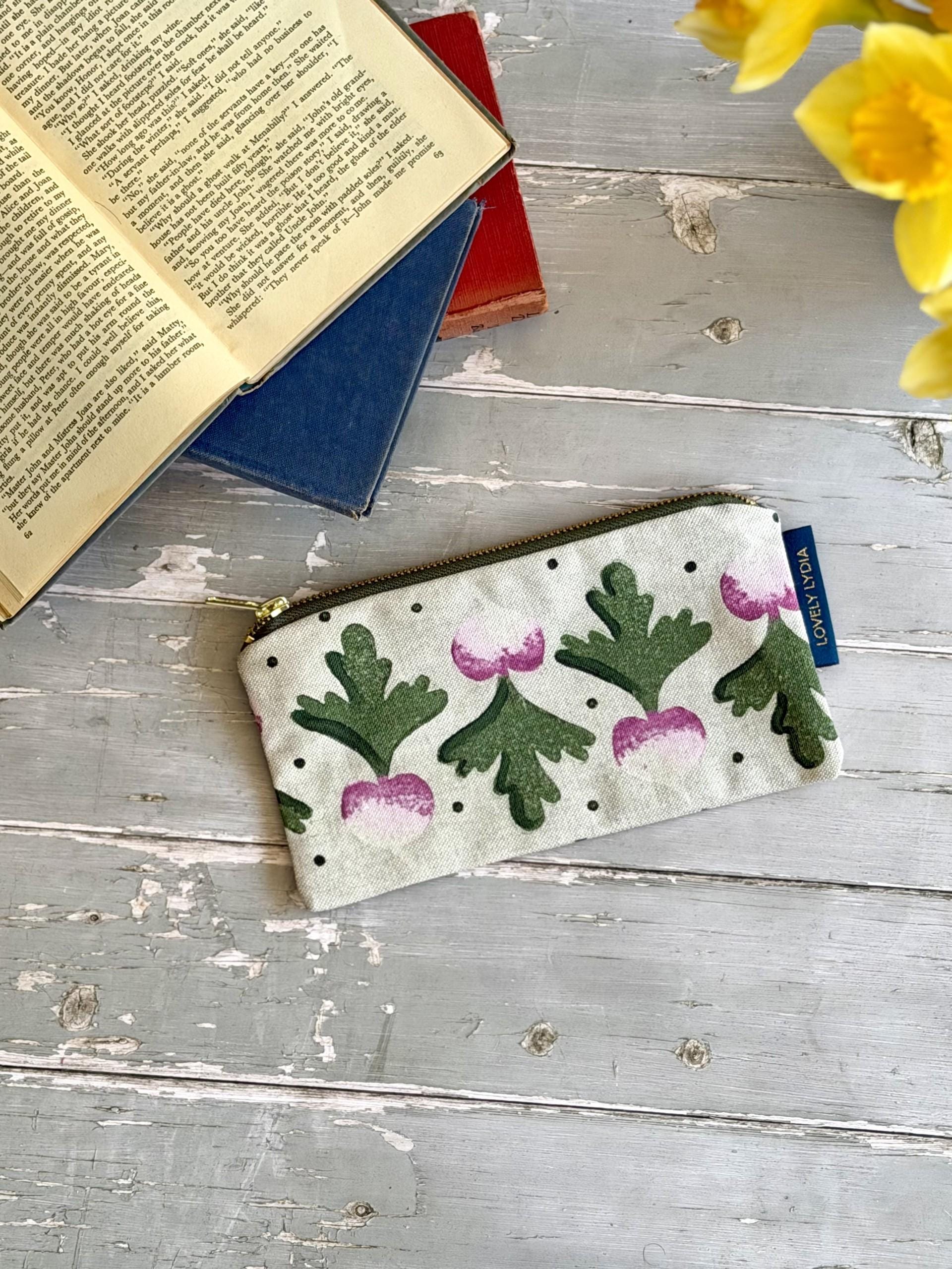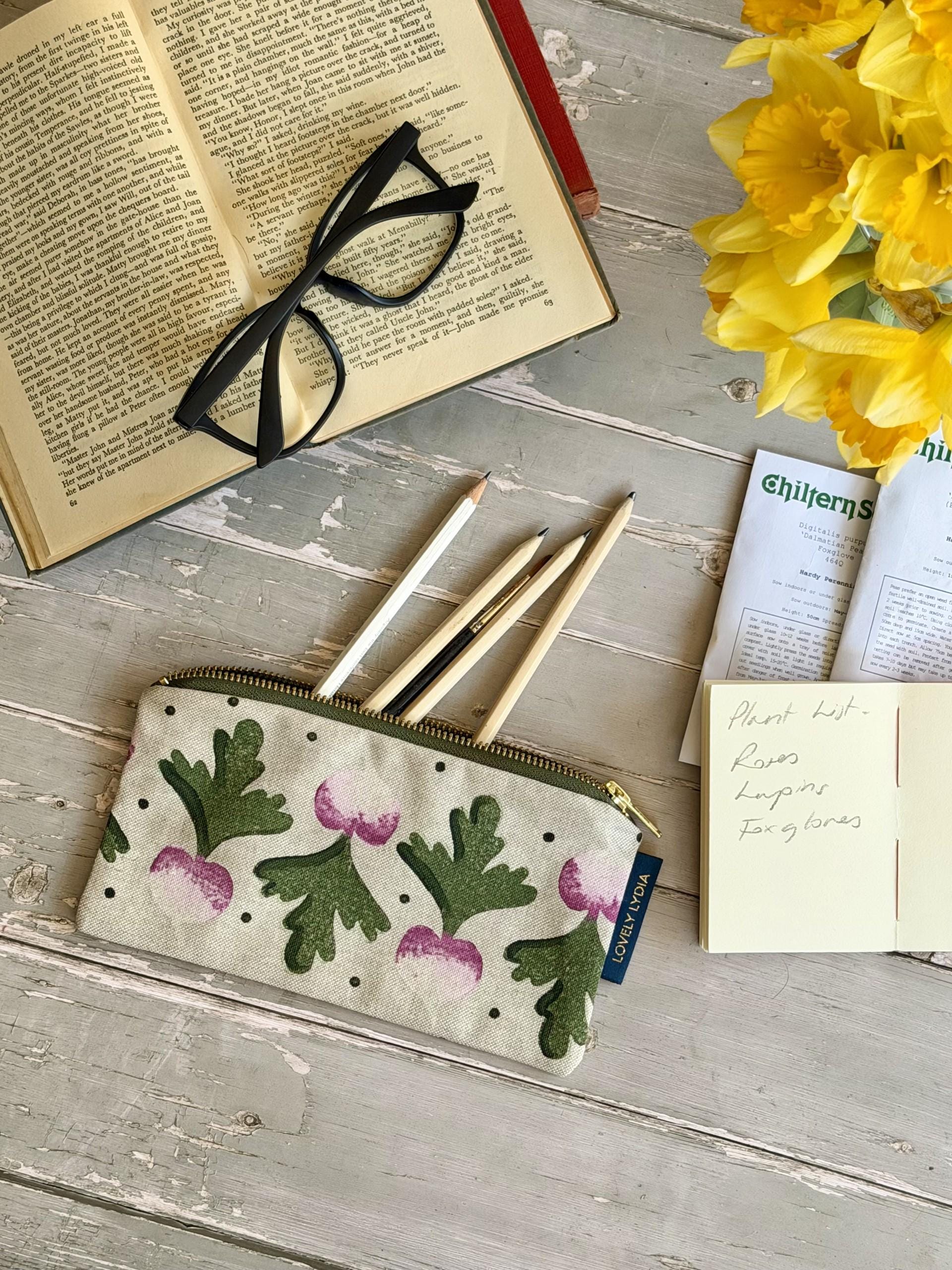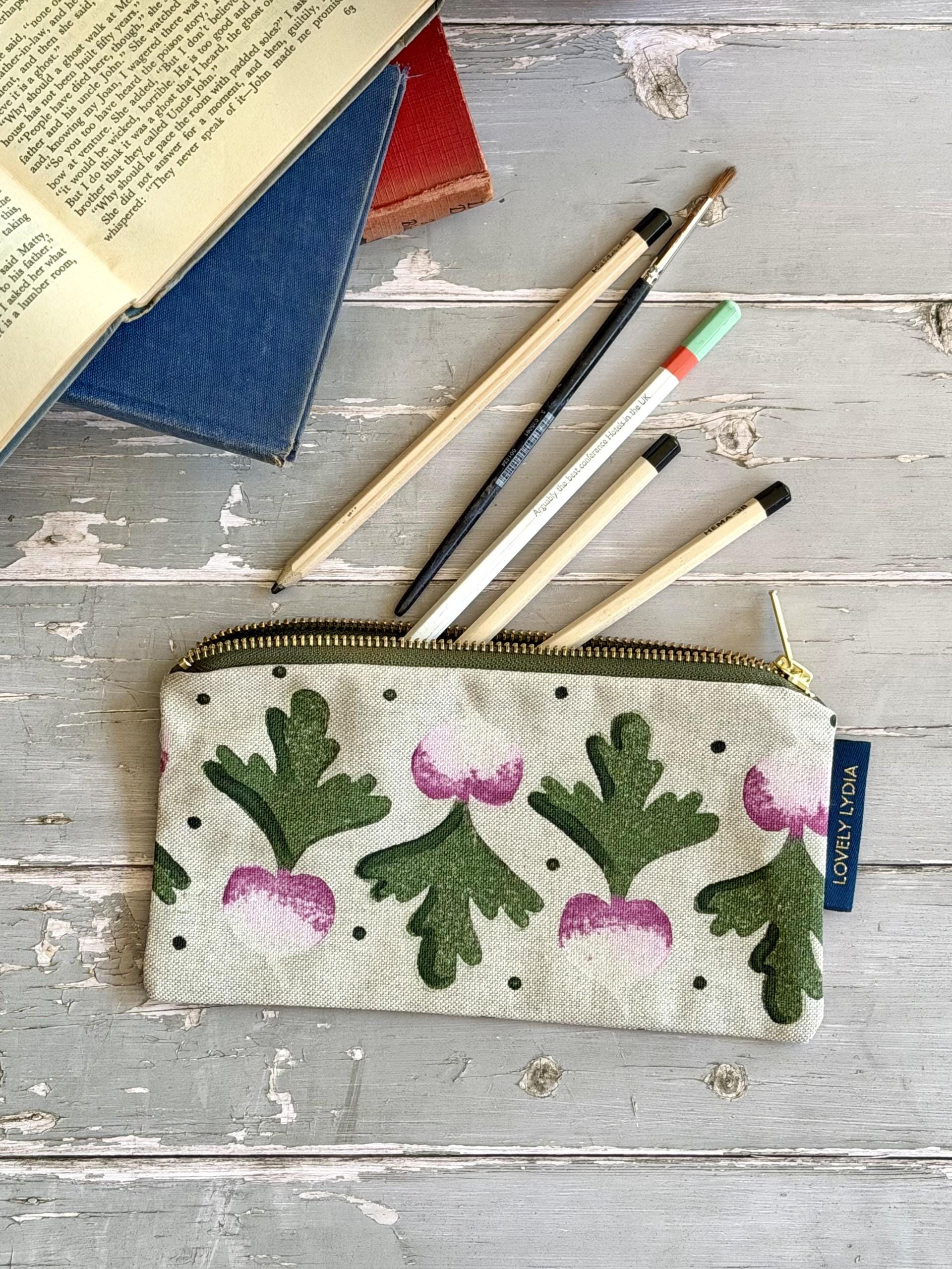 A little whimsy for your pencils and brushes – a handprinted radish print, inspired by English country cottage gardens, with a splash of Bridgerton, of Jane Austen, of Arts and Crafts and Liberty Print motifs. Fully lined with a contrast lining, this pencil case is both practical and beautiful.