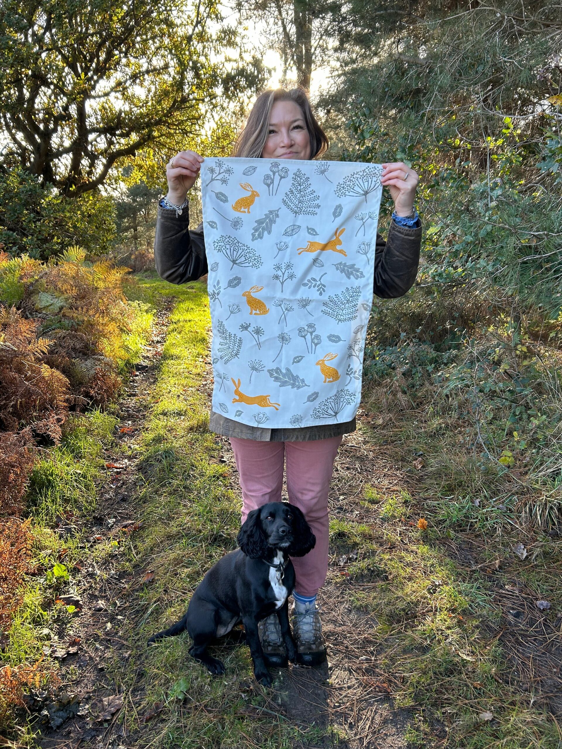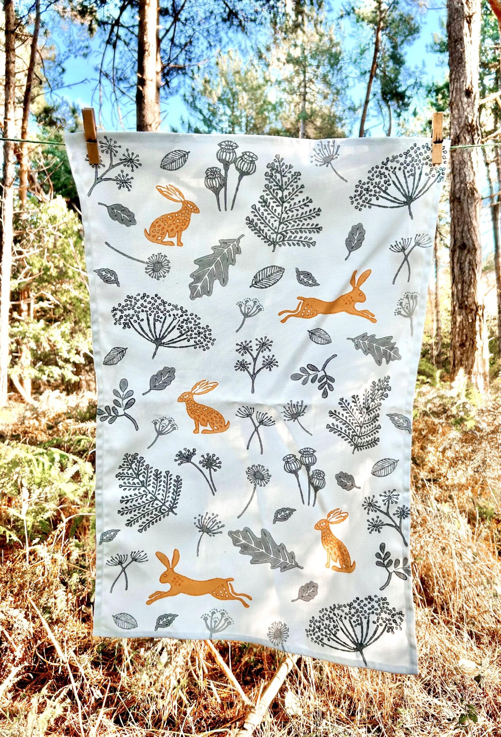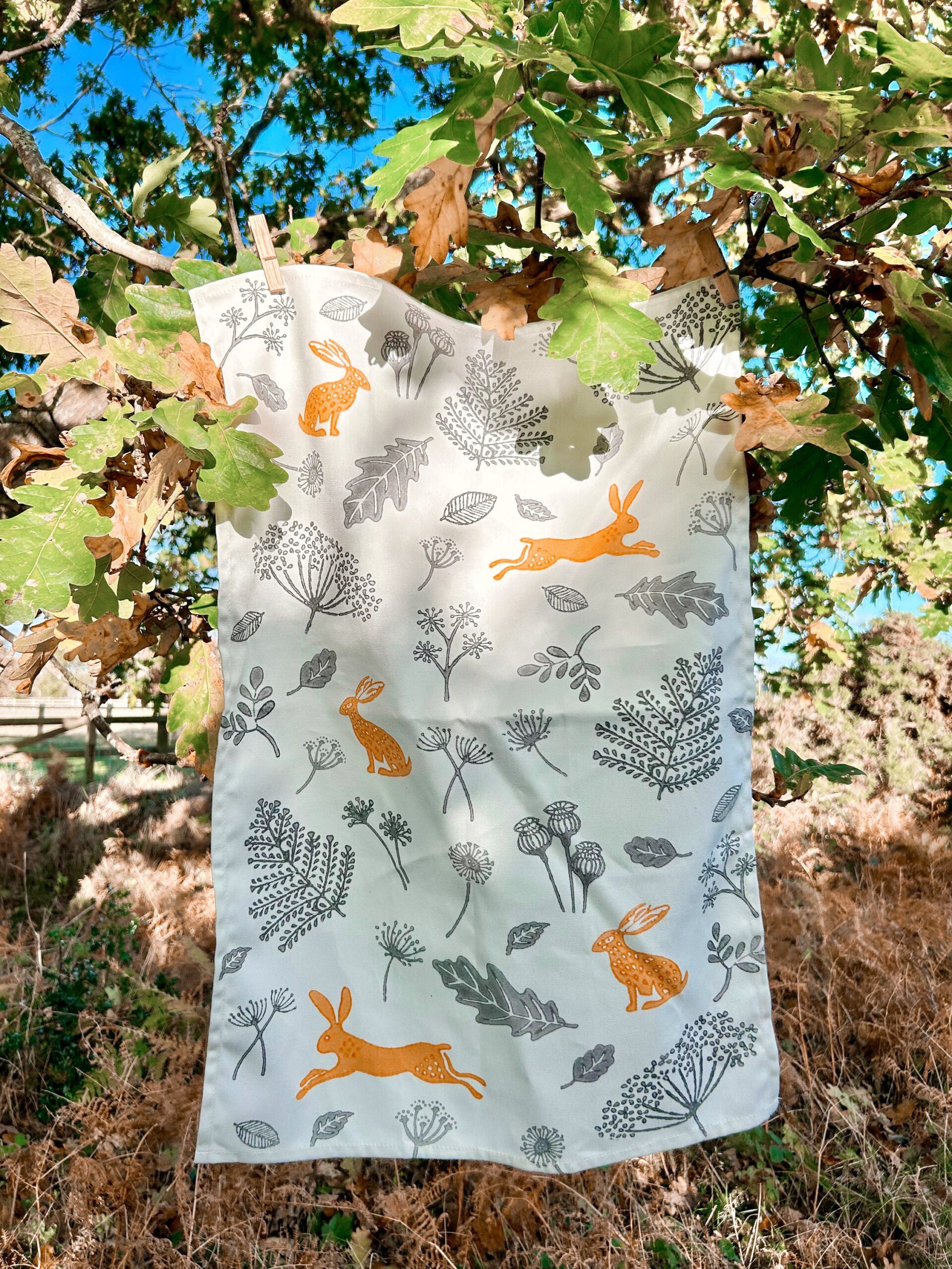 Adorned with a charming motif of leaping hares and seedheads, all my designs are inspired by the Suffolk countryside and coast where I live. The Hares are a rich mustard colour, the seedheads are in a slate grey.
