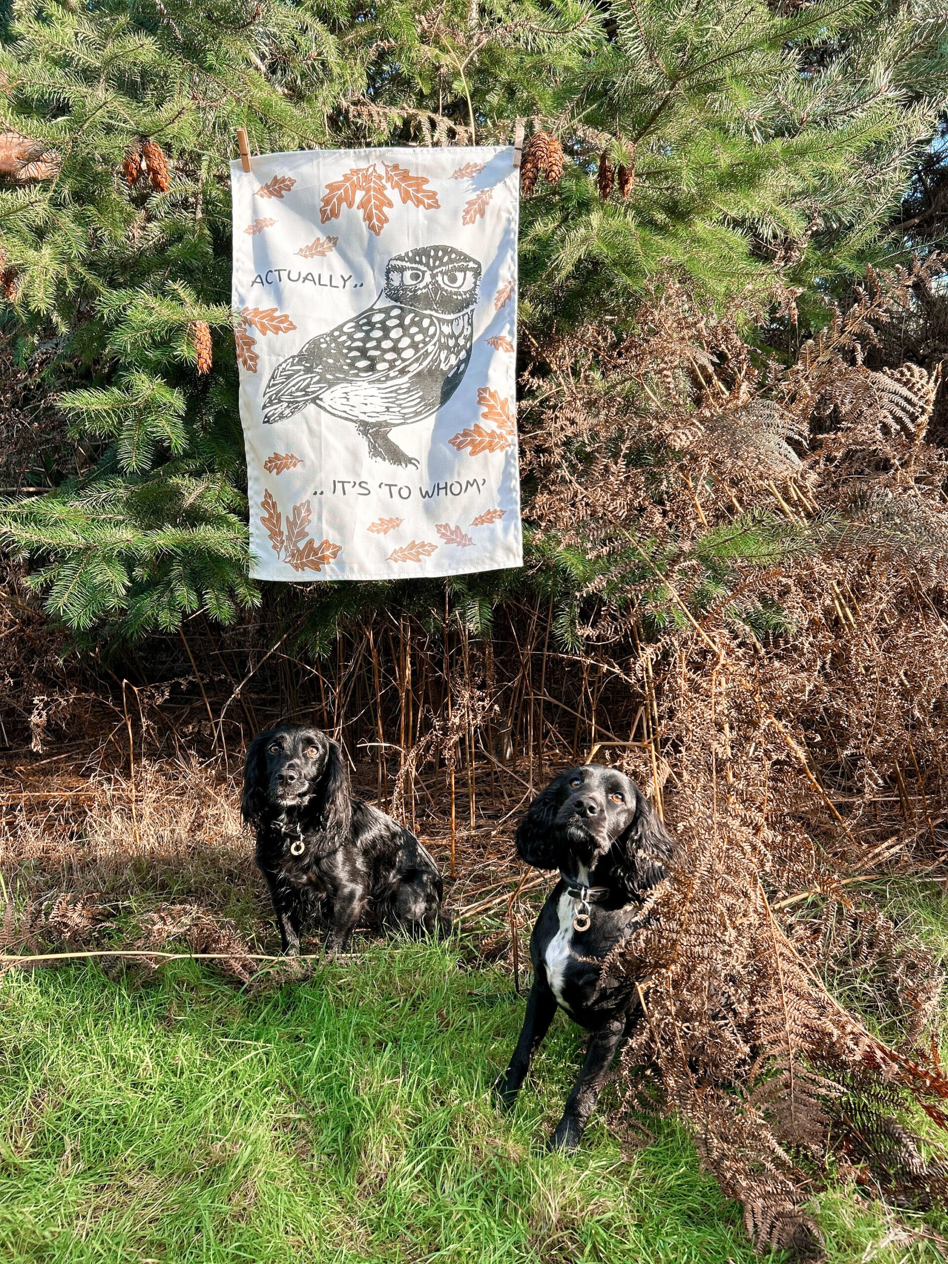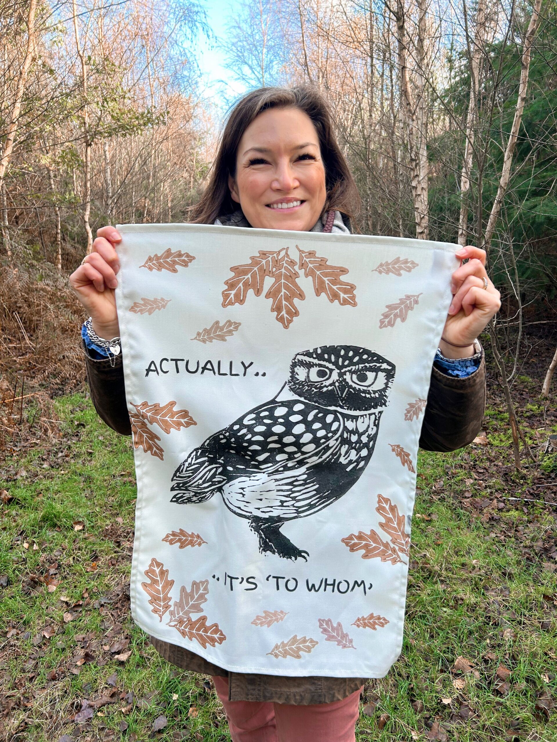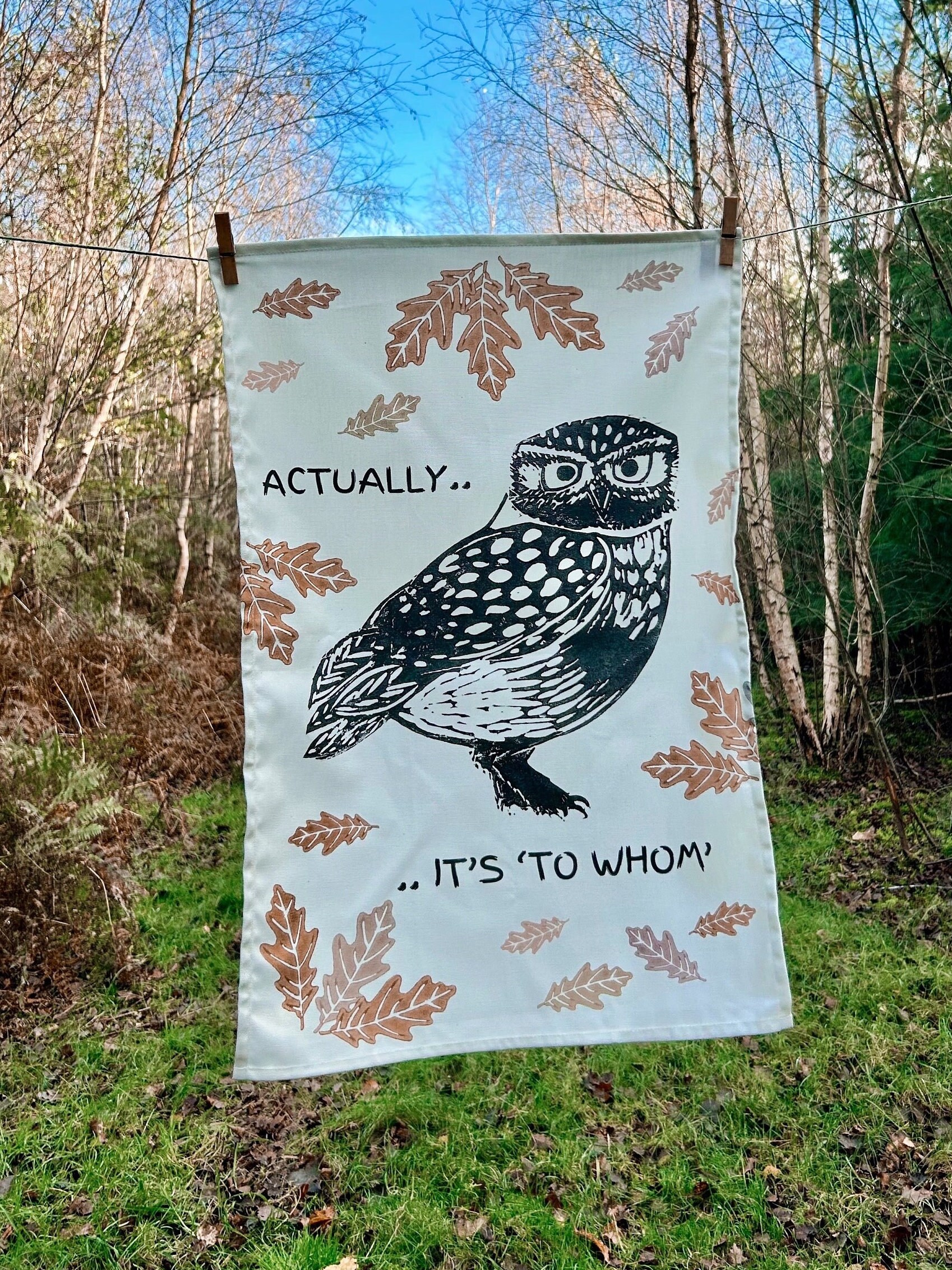 I have such a soft spot for Little Owls – they always look so furious! We are lucky to often see Little Owls (as well as Barn Owls, Tawny Owls and Short Earred Owls) on Orford Ness which is such a privilege.. I had to bring one into a print! Hope it raises a smile with the "Actually it's To Whom" wording..