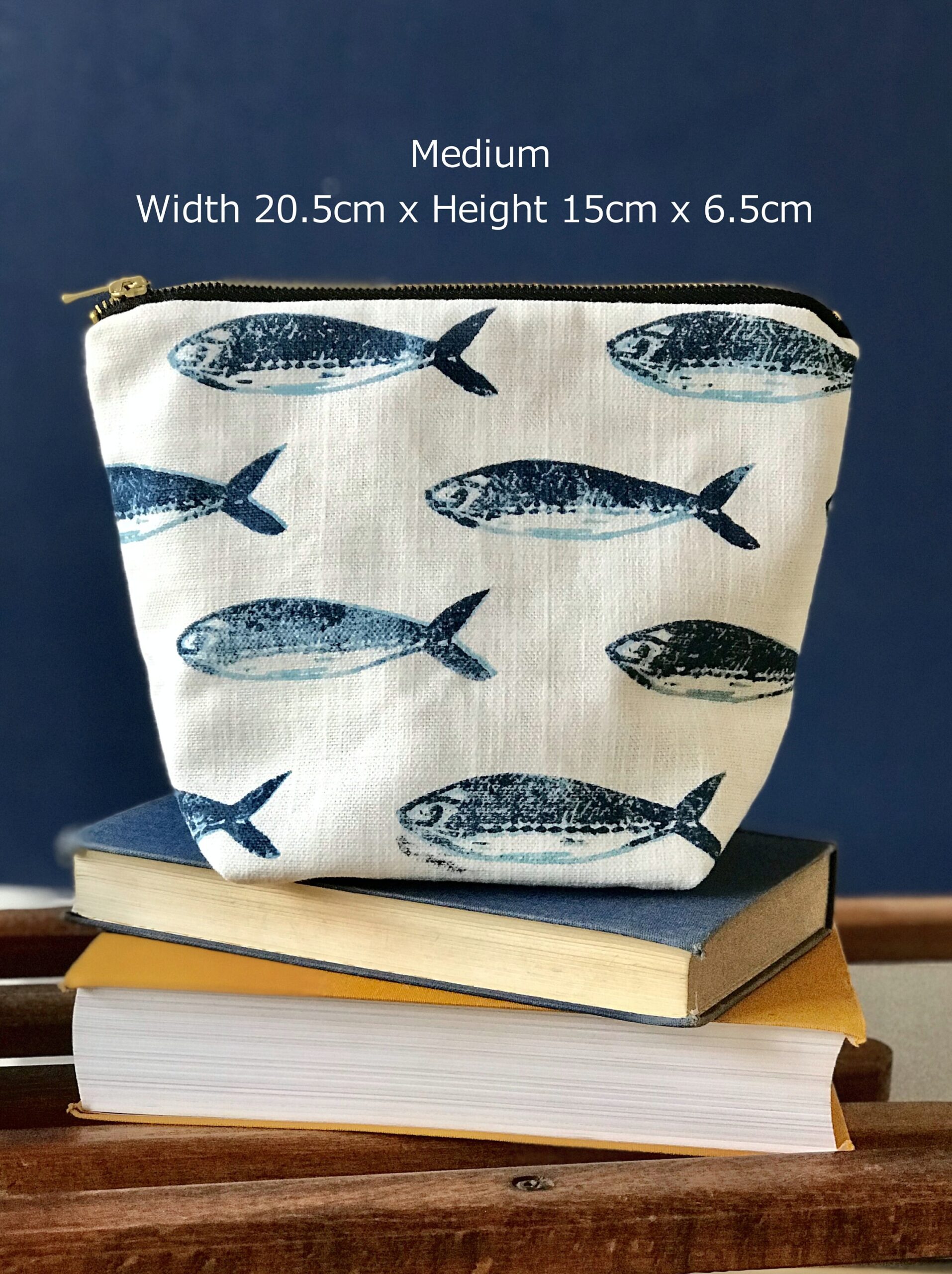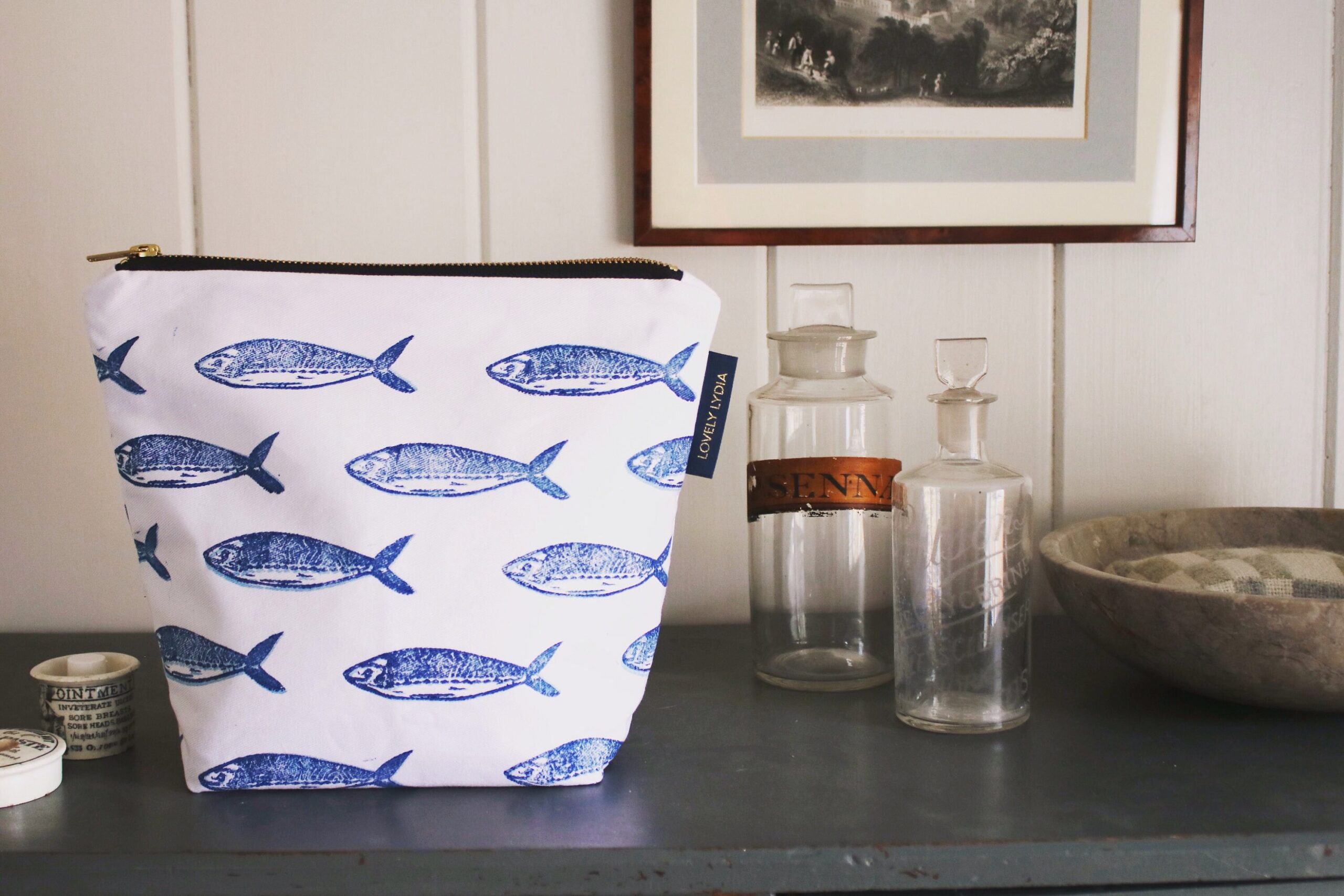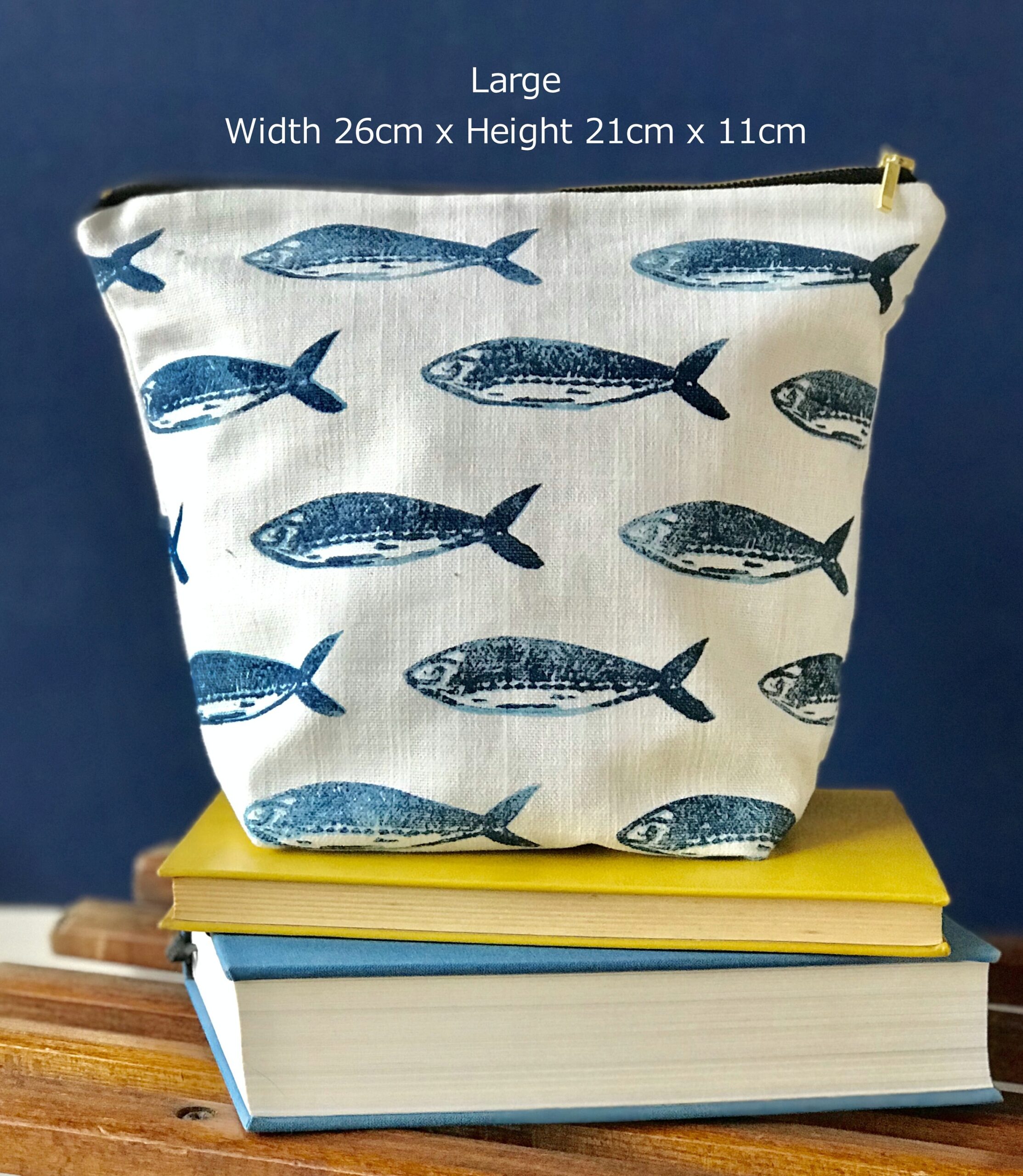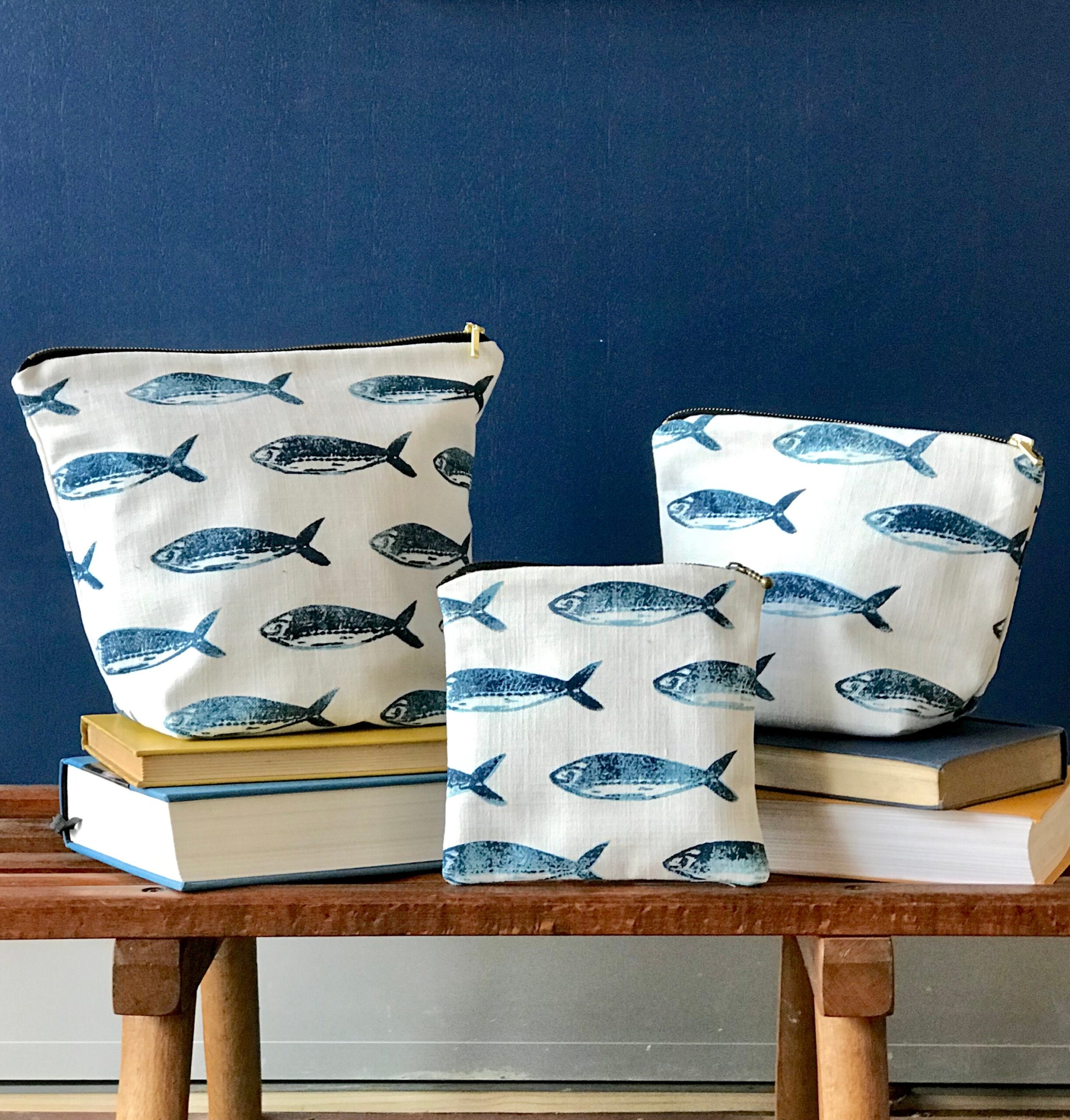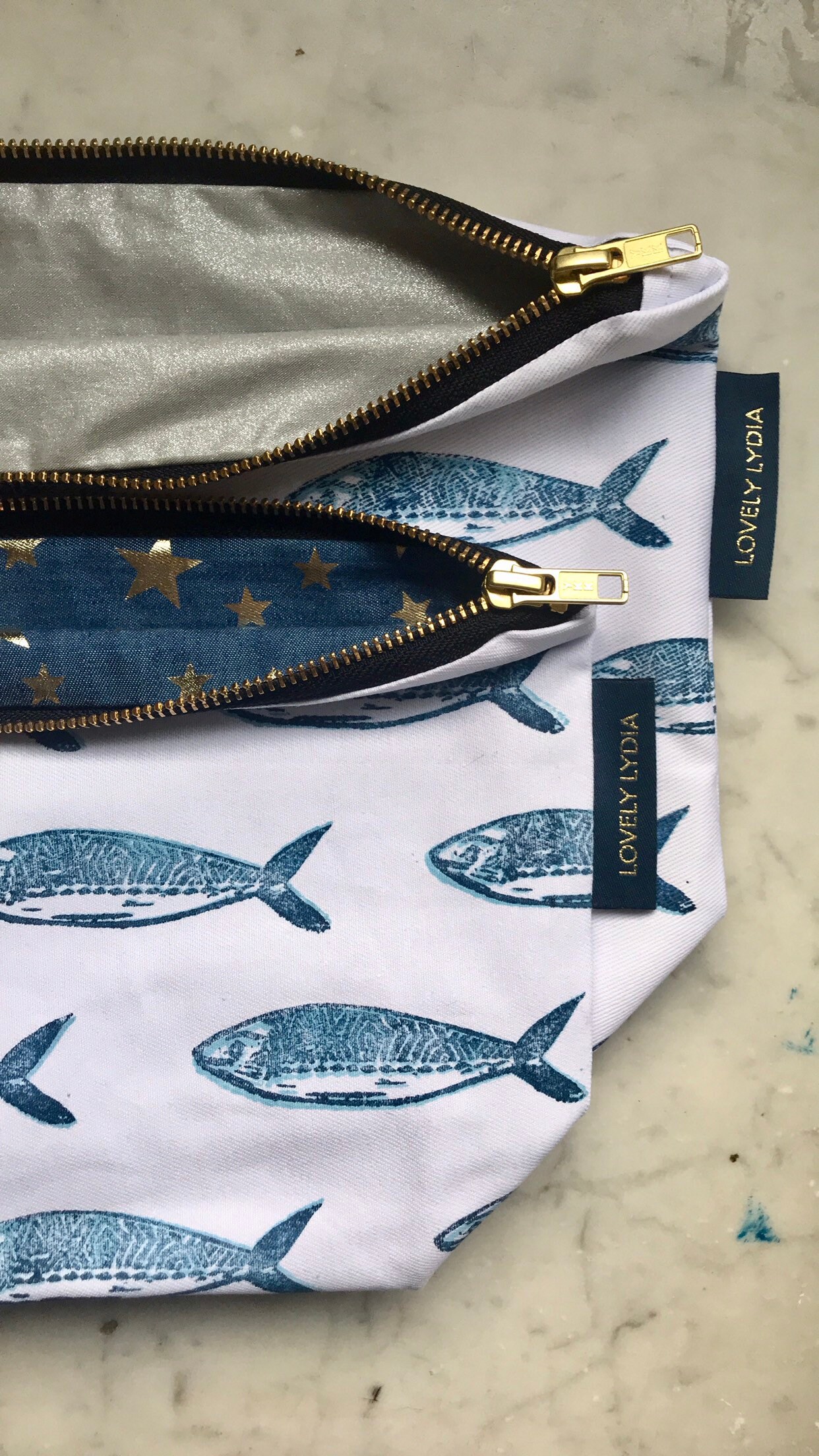 A lovely Wash Bag Zipper Purse hand printed in my fun Mackerel Motif, inspired by the rivers and North Sea near my home in Suffolk. I block print each one by hand so they are all unique!
