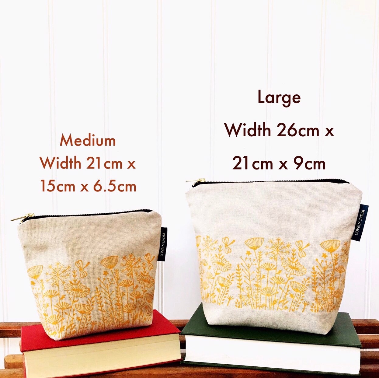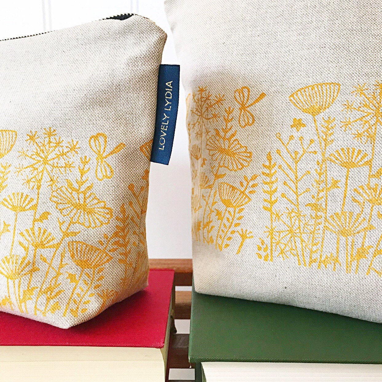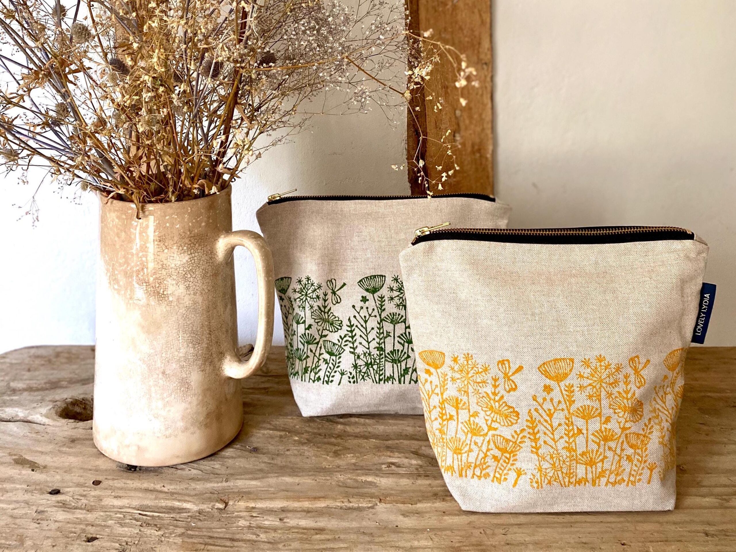 A lovely Wash bag Zipper hand printed in my Meadow Sweet Motif, inspired by the countryside around my home in Suffolk. I block print each one by hand so they are all unique!