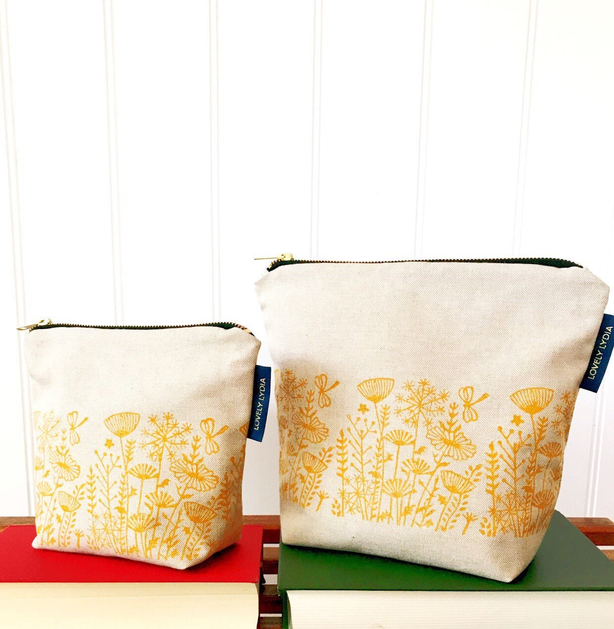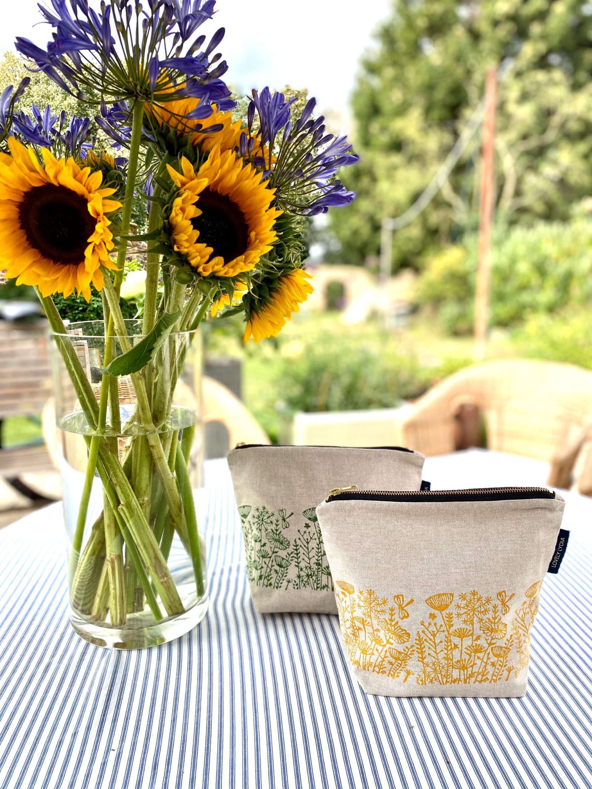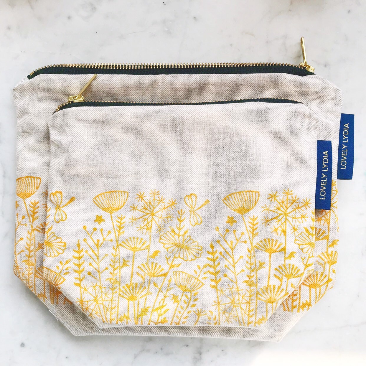 A lovely Wash bag Zipper hand printed in my Meadow Sweet Motif, inspired by the countryside around my home in Suffolk. I block print each one by hand so they are all unique!