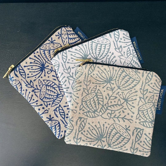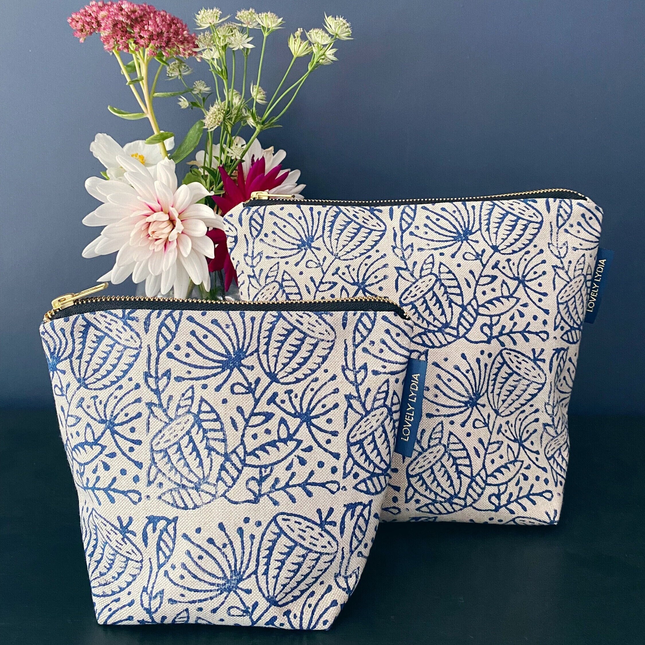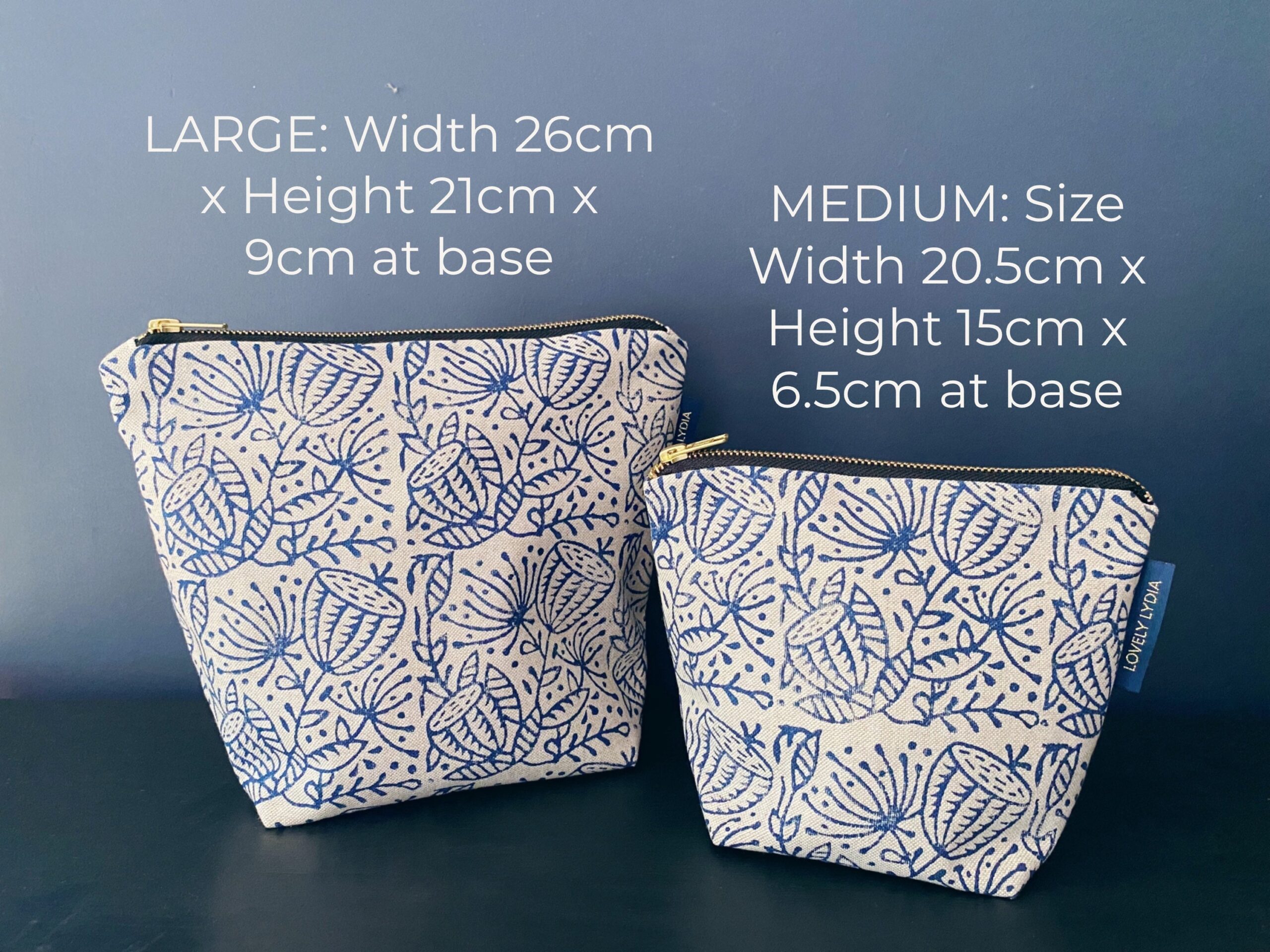 A lovely Handprinted Washbag Zipper in my Angelica Print, available in 3 autumnal colours. I block print each one by hand so they are all unique!