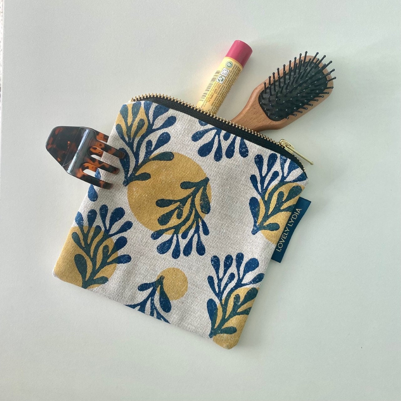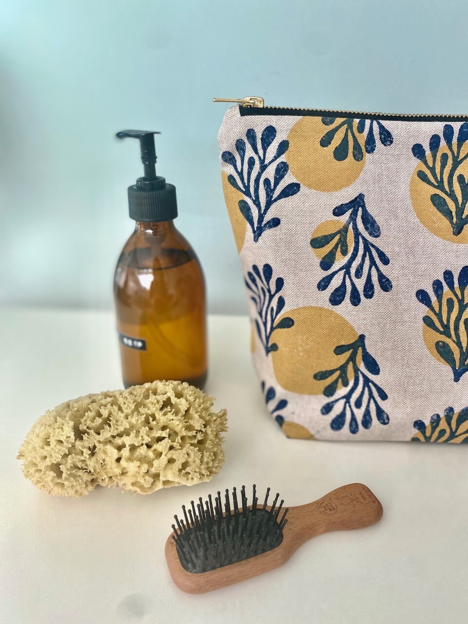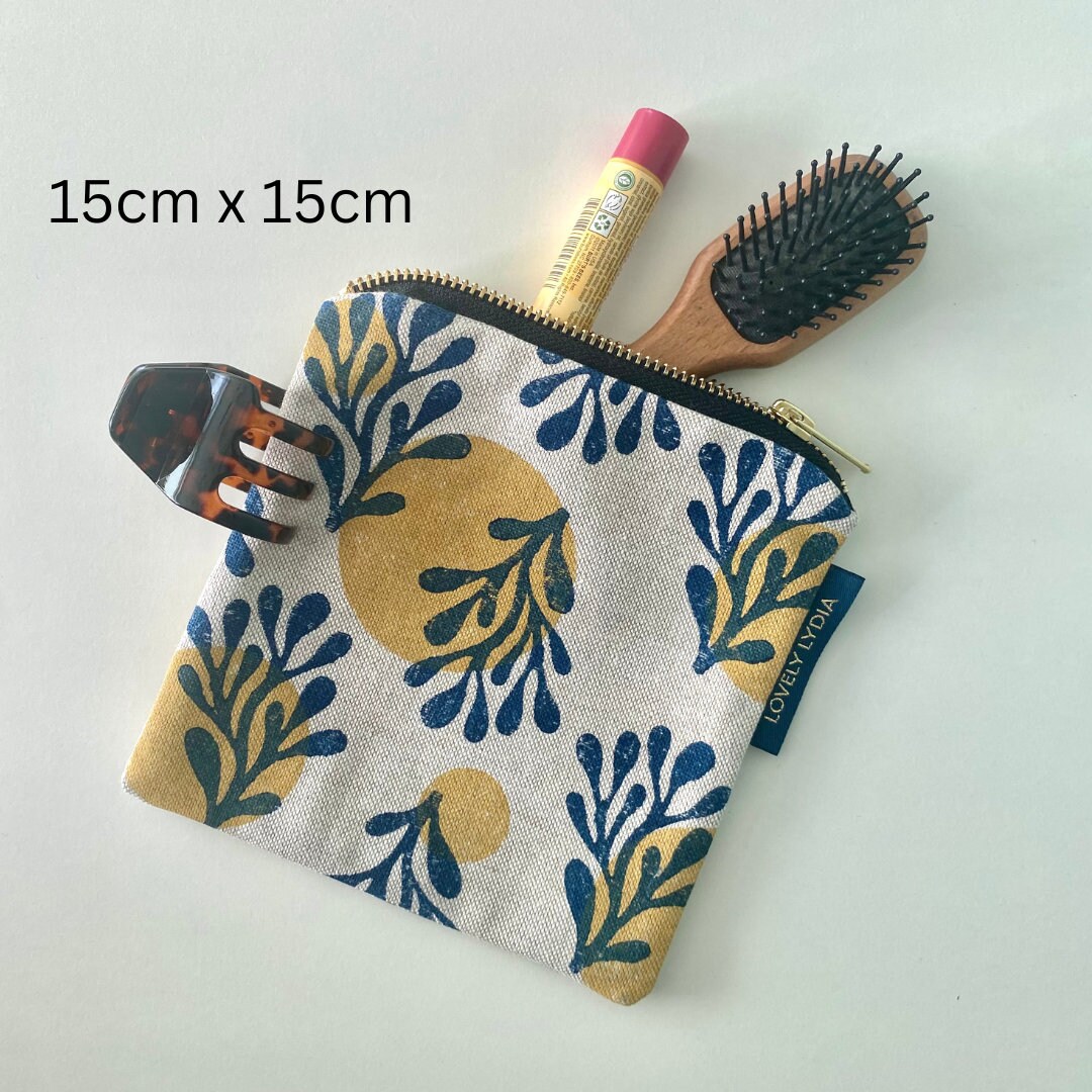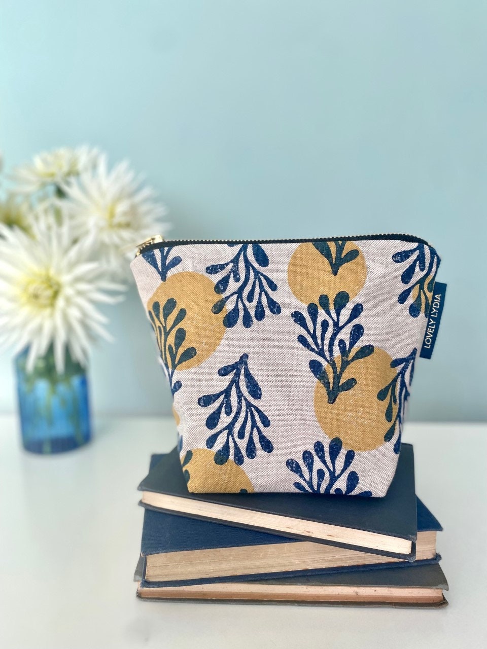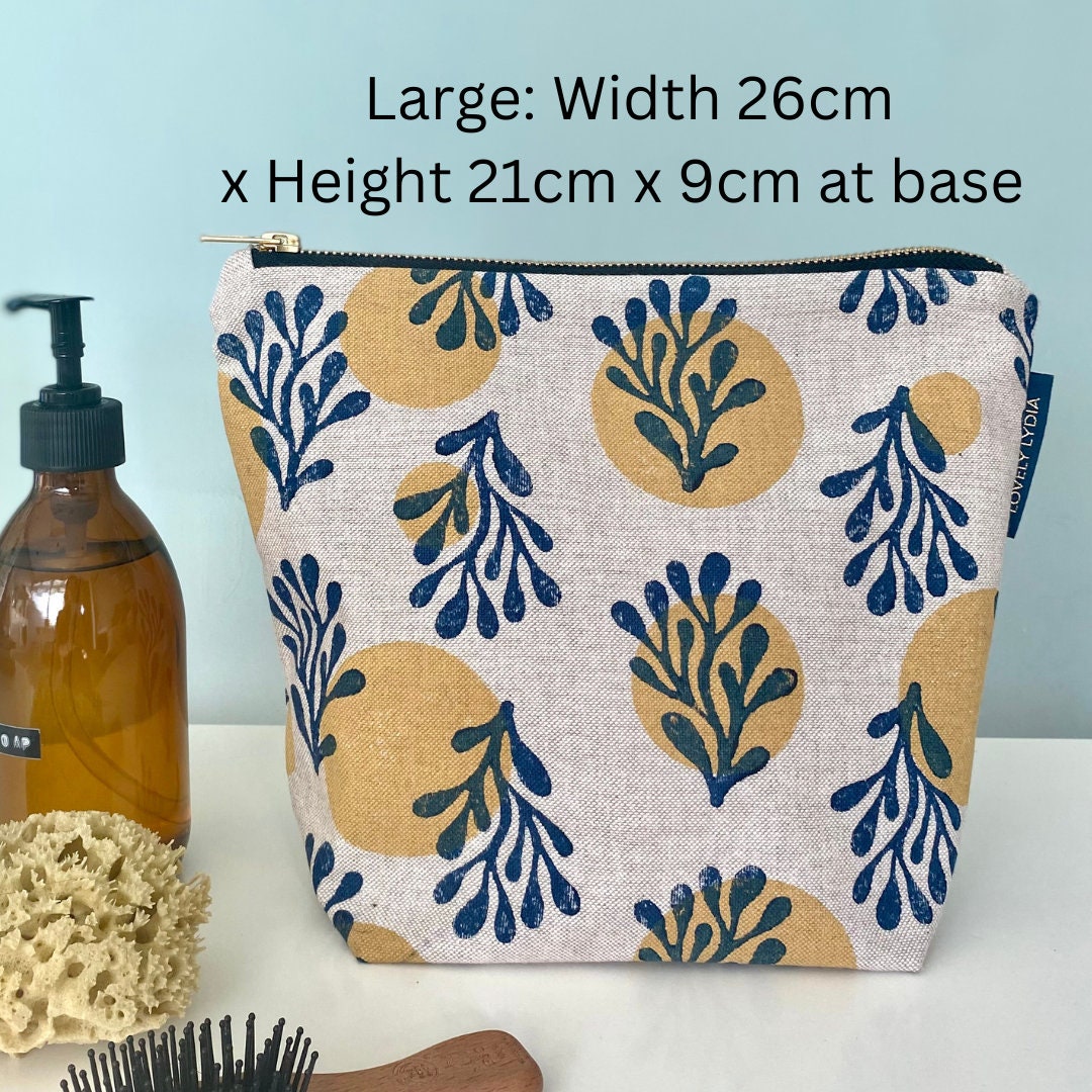 A fetching Wash bag Zipper hand printed with a seaweed Motif against circles of colour- Navy Seaweed against mineral yellow circles.