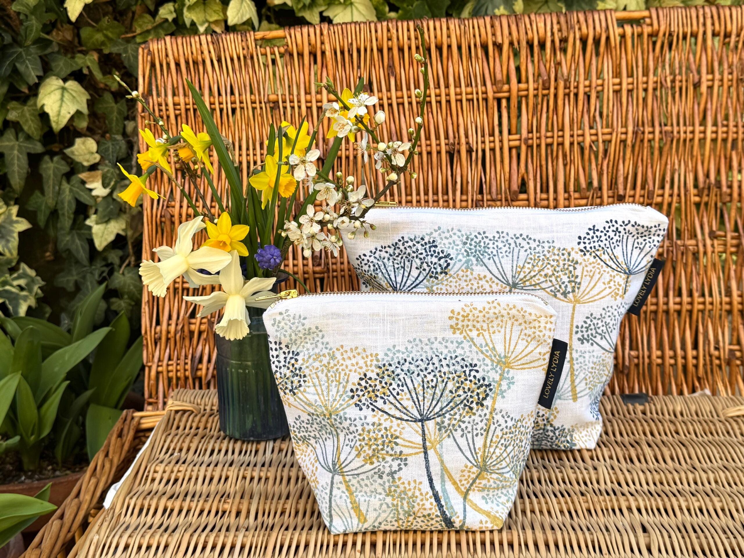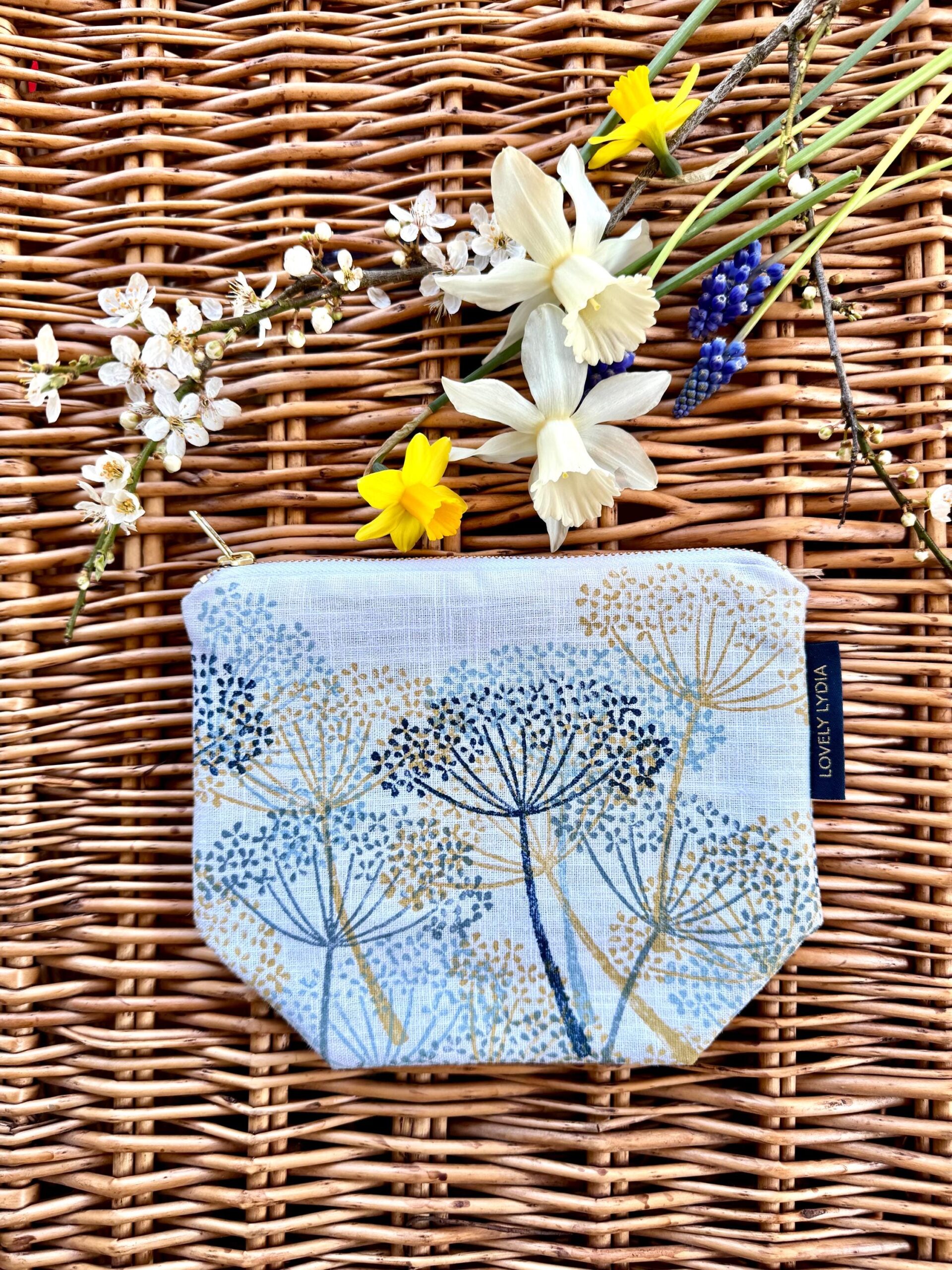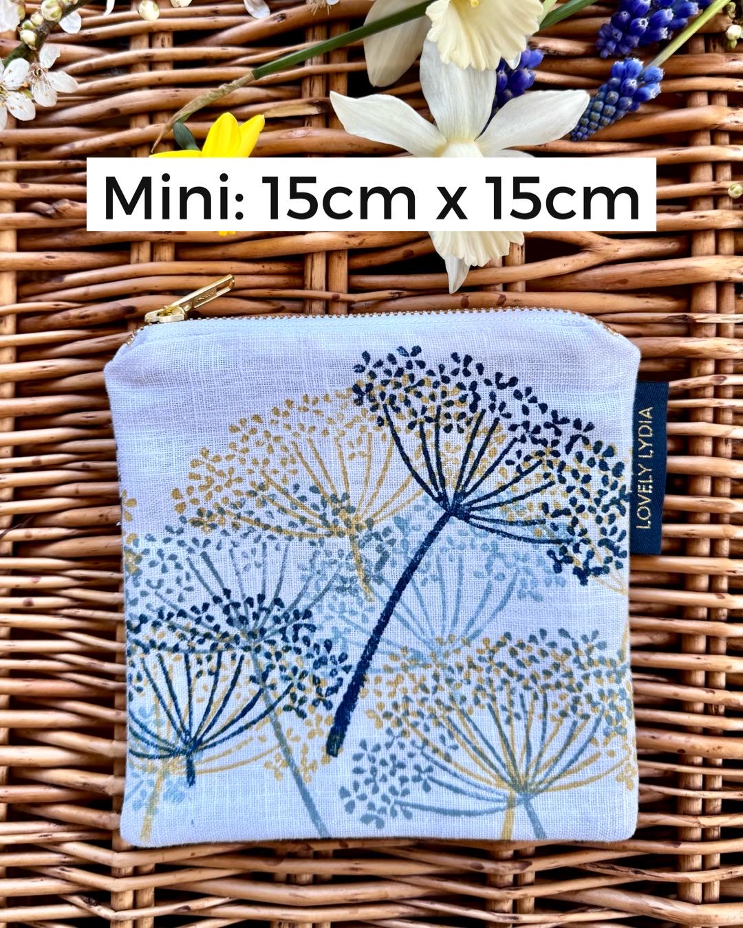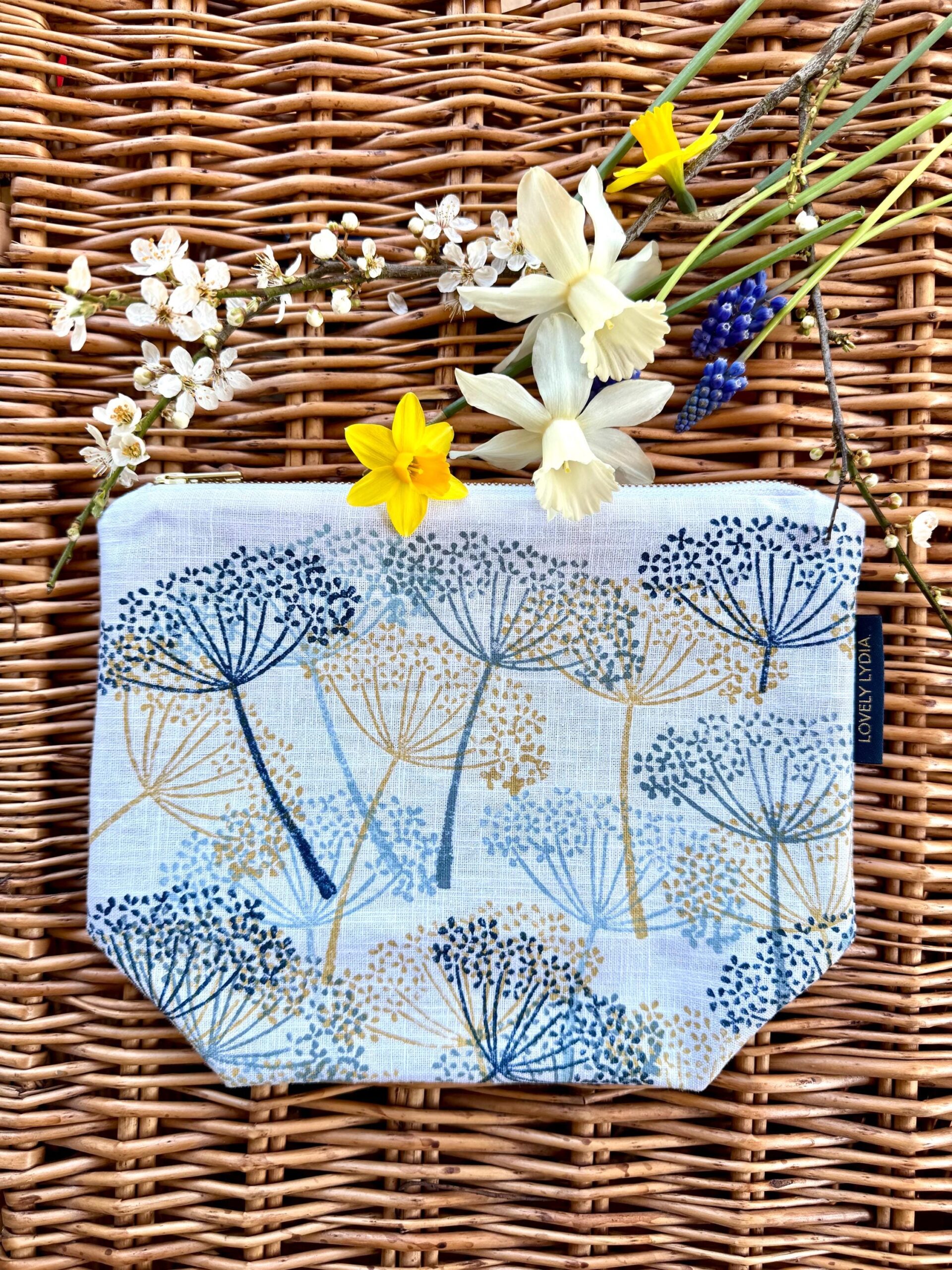 In Spring Cow Parsley abounds in clouds of frothy white flowers in the Hedgerows round the Suffolk Coast. It looks so joyful and bountiful, abounding with bees, butterflies and pollinators. This print evokes these messy banks of cow parsley, in Spring Gold (Indian Yellow) , pale, mid and deep blues against a white linen background. Carry this little bit of handprinted Suffolk art